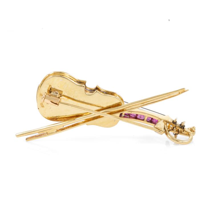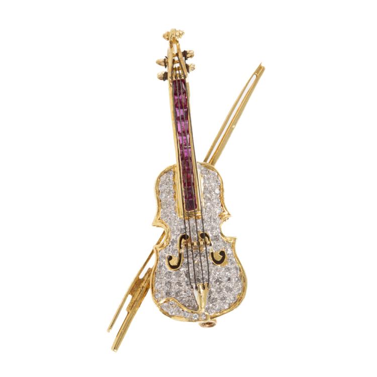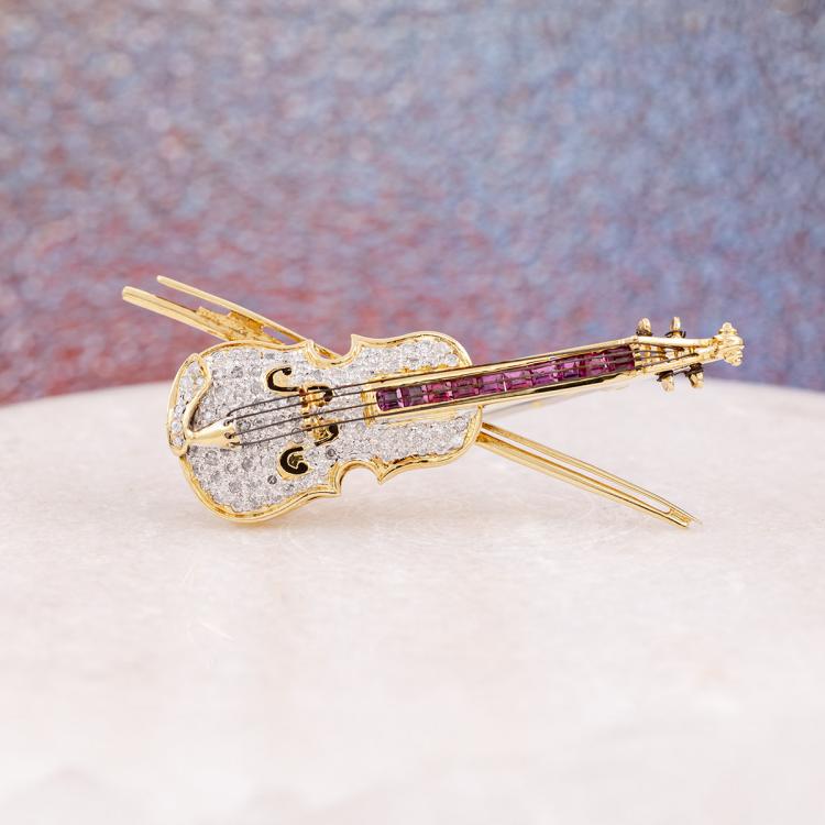 Ruby and Diamond Violin Brooch/pendant with square cut Natural Rubies totalling approximately 0.60ct and round Natural Diamonds totalling approximately 0.50ct (Estimated grading: H P1). 18ct yellow gold. Weight: 12.0g. (Pre-owned)