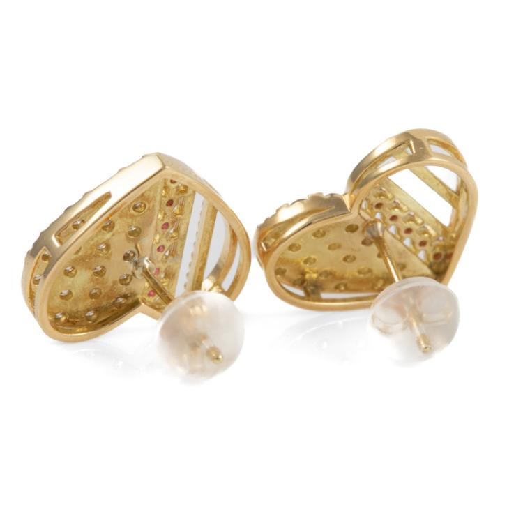 Ruby and Diamond heart design earrings with round Natural Rubies totalling 0.12ct and round Natural Diamonds totalling 0.60ct (Estimated grading: J-K P1). 18ct yellow gold with gold and silicon backs. Motif size 12.0mm x 13.6mm. Weight: 3.3g. (Pre-owned)