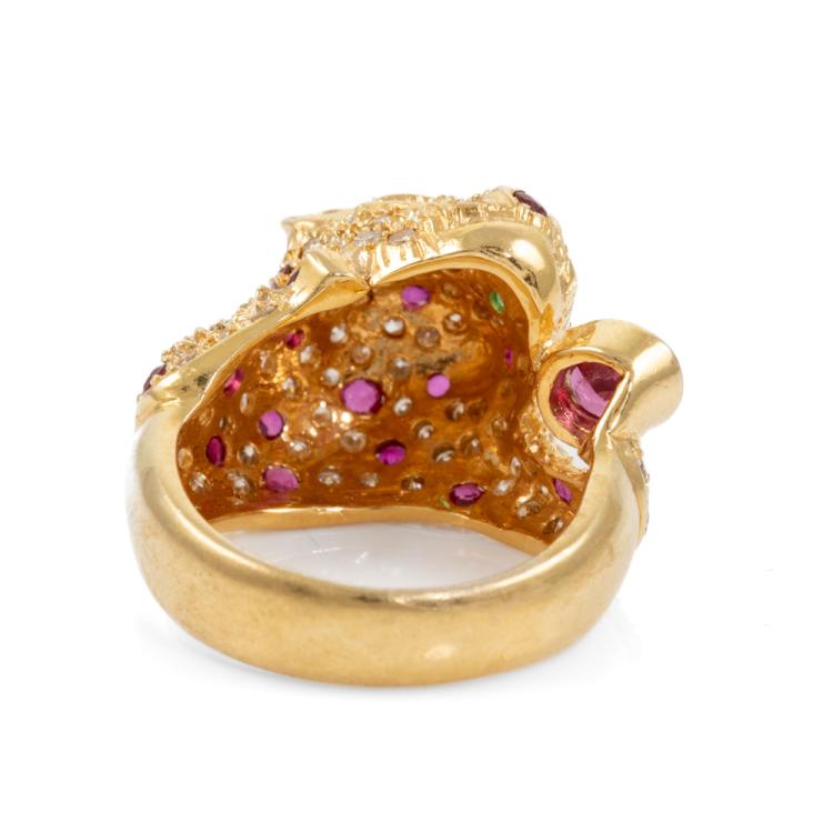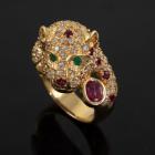 Panther designed ring with oval shape and round natural Rubies totalling 1.20ct, round natural Emerald totalling approximately 0.04ct and round natural Diamonds totalling 1.15ct (Estimated grading: H SI-P1). 18ct yellow gold. Ring size L1/2. Band width: 4.7mm- 7.3mm. Weight: 11.6g. (Pre-owned)