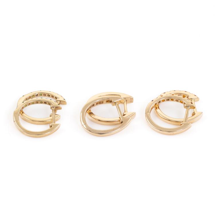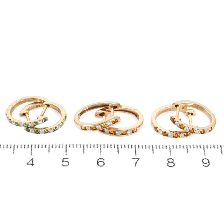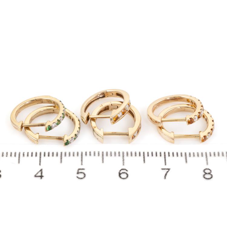 Set of 3 huggie Diamond & gemstone earrings; 1) 2 pairs of huggie earrings with round Natural Citrines totalling 0.18ct with round Natural Diamonds totalling 0.20ct. 2) 1 pair of Garnet earrings with round Natural Tsavorite Garnets totalling approximately 0.12ct and round Natural Diamonds totalling 0.10ct. Set in 9ct yellow gold. Total weight of 3 earrings: 4.8g. (As new)