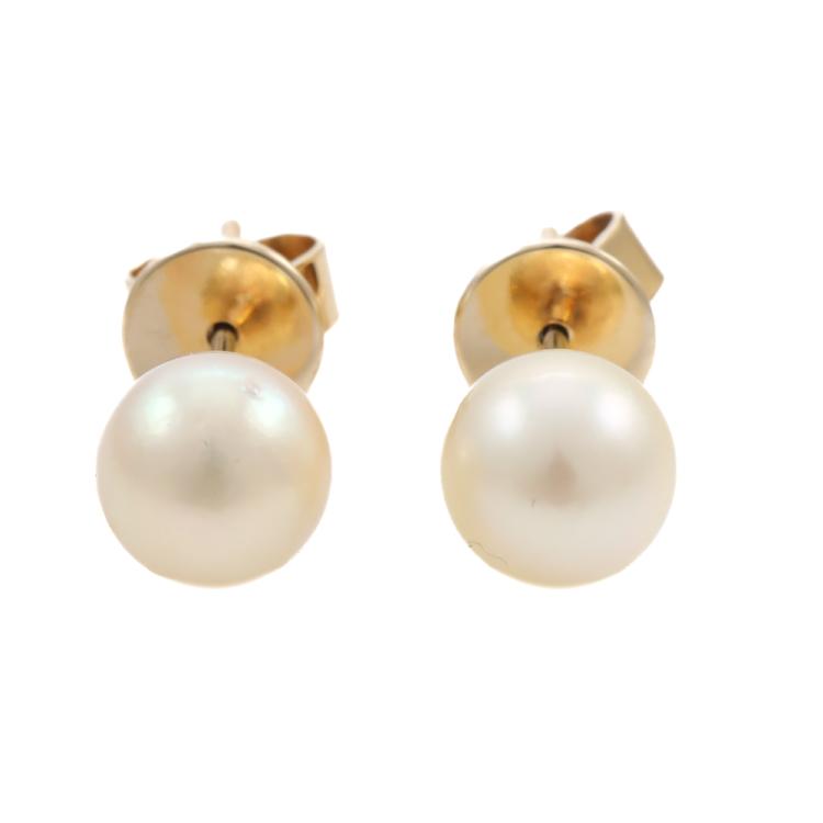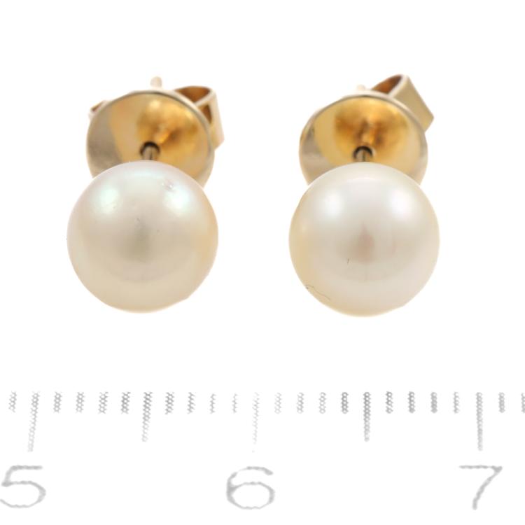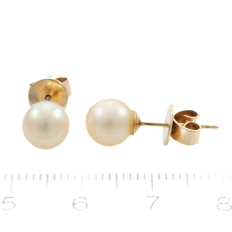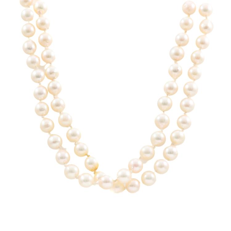 Set of Pearl Necklace and Earrings. 1) Pearl necklace with 115 Akoya Pearls of 6.3mm - 6.8mm. Length: 94.0cm with no clasp. 2) Pearl stud earrings with 2 Akoya Pearls of 7.1mm. 14ct yellow gold. Total Weight: 52.7g. (Pre-owned)