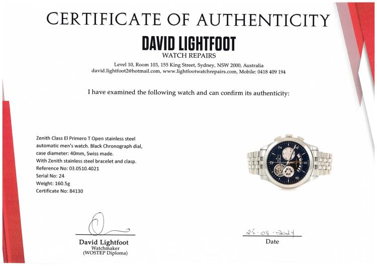 Zenith Class El Primero T Open stainless steel automatic men's watch. Black Chronograph dial, case diameter: 40mm, wrist size: 16cm, Swiss made. Ref# 03.0510.4021. With Zenith stainless steel bracelet and clasp. With Certificate of Authenticity. 3 month FSA warranty. (Pre-owned)