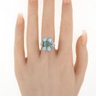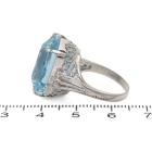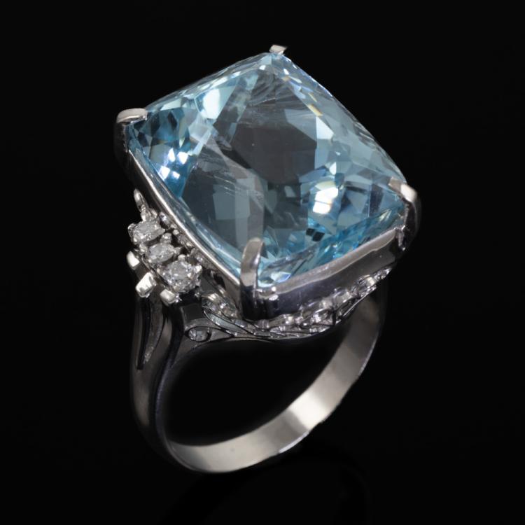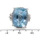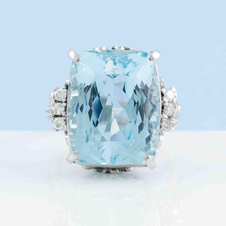 Aquamarine and Diamond ring with cushion cut natural Aquamarine of 15.40ct and round natural Diamonds totalling 0.12ct. Platinum 900. Ring size K. Band width: 2.5mm - 3.7mm. Weight: 10.3g. With Certificate #418760. (Pre-owned)