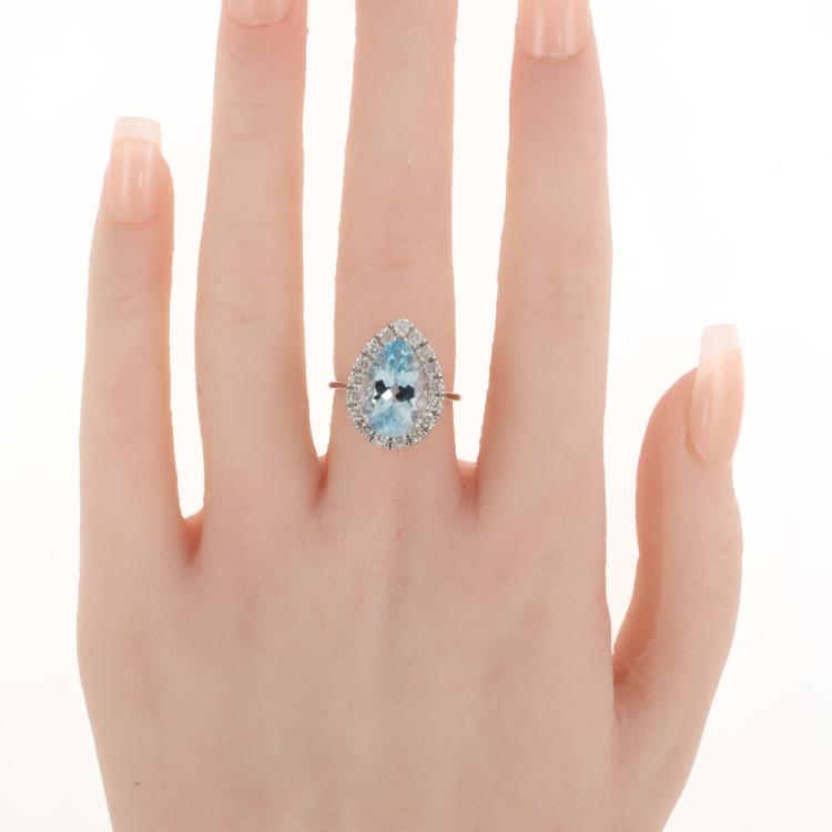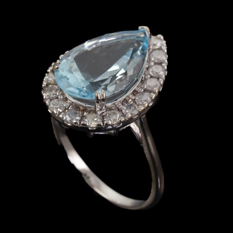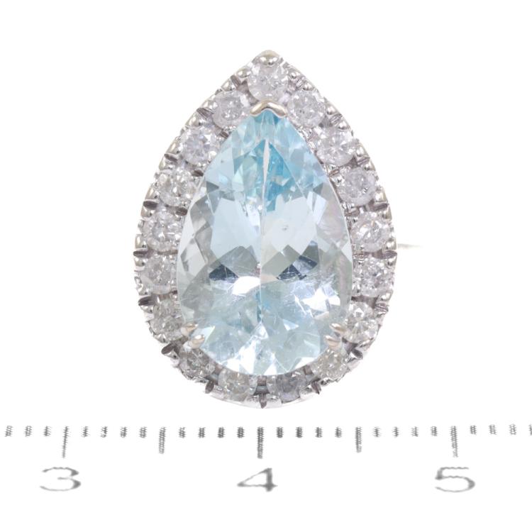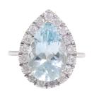 Aquamarine and Diamond ring with pear shape Natural Aquamarine of 3.76ct and round Natural Diamonds totalling 0.63ct (With Valuation Certificate graded as H-K P1). 14ct white gold. Ring size: L. Width: 1.7mm - 1.2mm. Weight: 3.9g (Pre-owned)