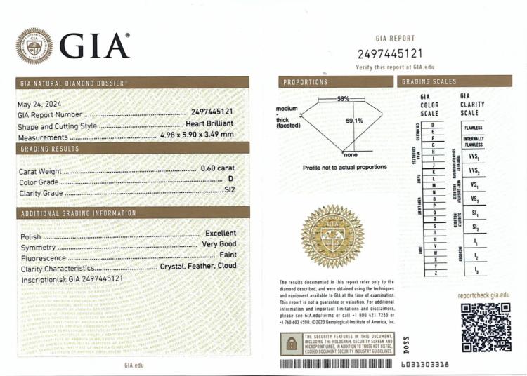 A loose heart shape natural Diamond of 0.60ct (with GIA Summary Report graded as D SI2 #2497445121). (New)
