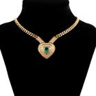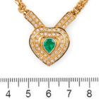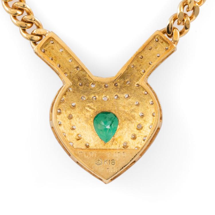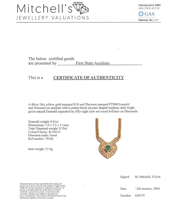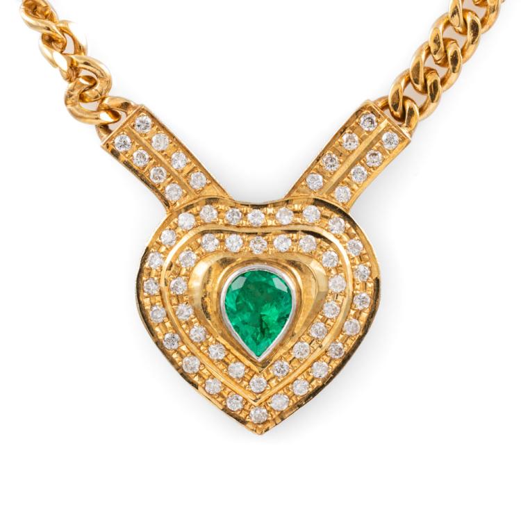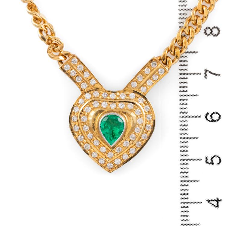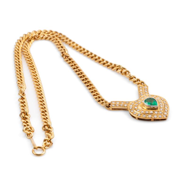 Emerald and Diamond pendant with natural pear Emerald of 0.61ct and round natural Diamonds totalling 0.78cts (Estimated grading : H-I SI-P1). 18ct yellow gold and platinum 900. Length: 40cm. Weight: 27.4g. With certificate. (Pre-owned)