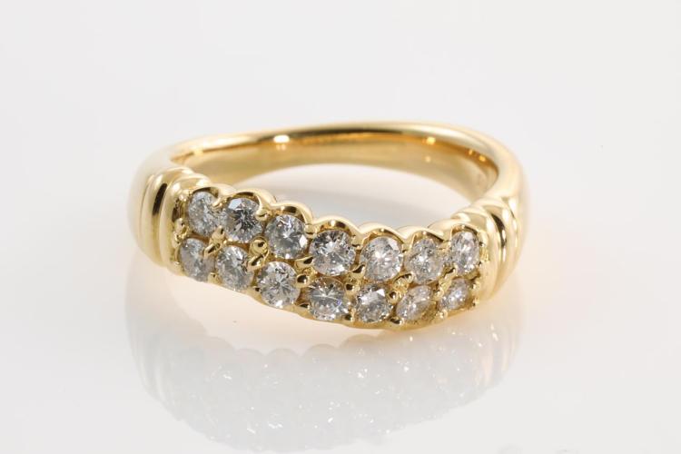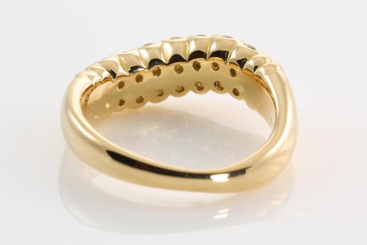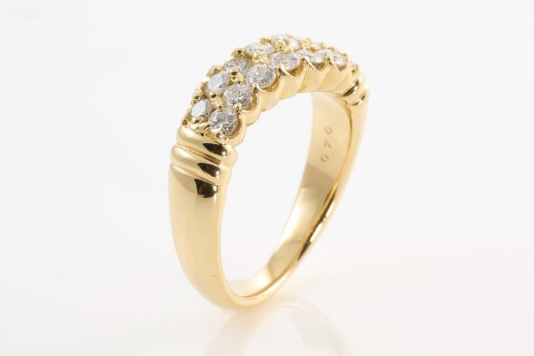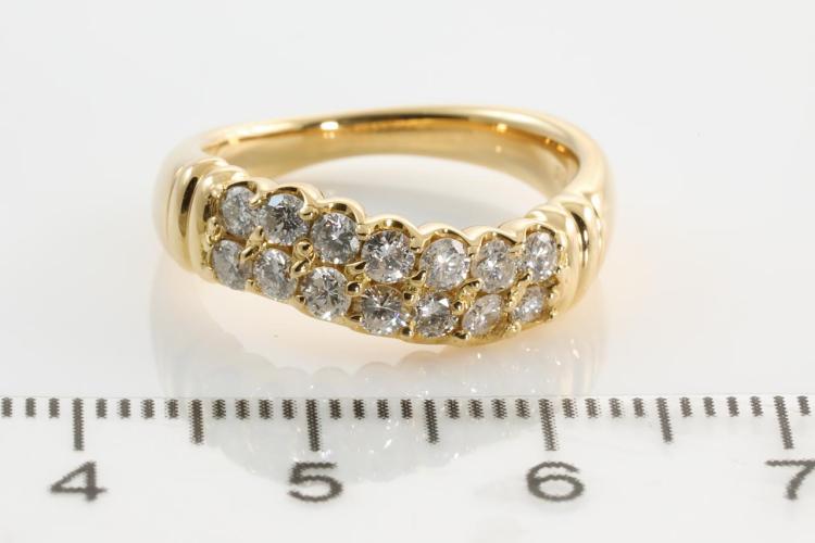 Diamond dress ring with round Natural Diamonds totalling 0.70ct (Estimated grading: H-I P1). 18ct yellow gold. Ring size: K1/2 - Note this ring can only be resized up by a maximum of 3 sizes, down by ring clip. Weight: 7.2g. (Pre-owned)^
