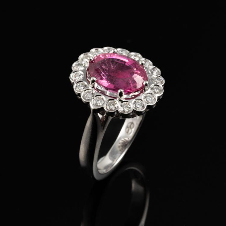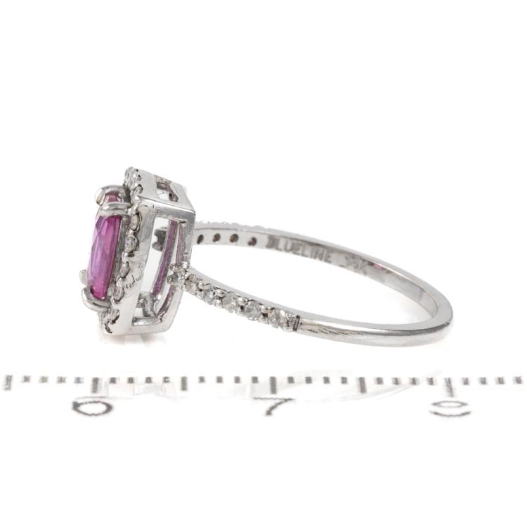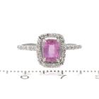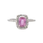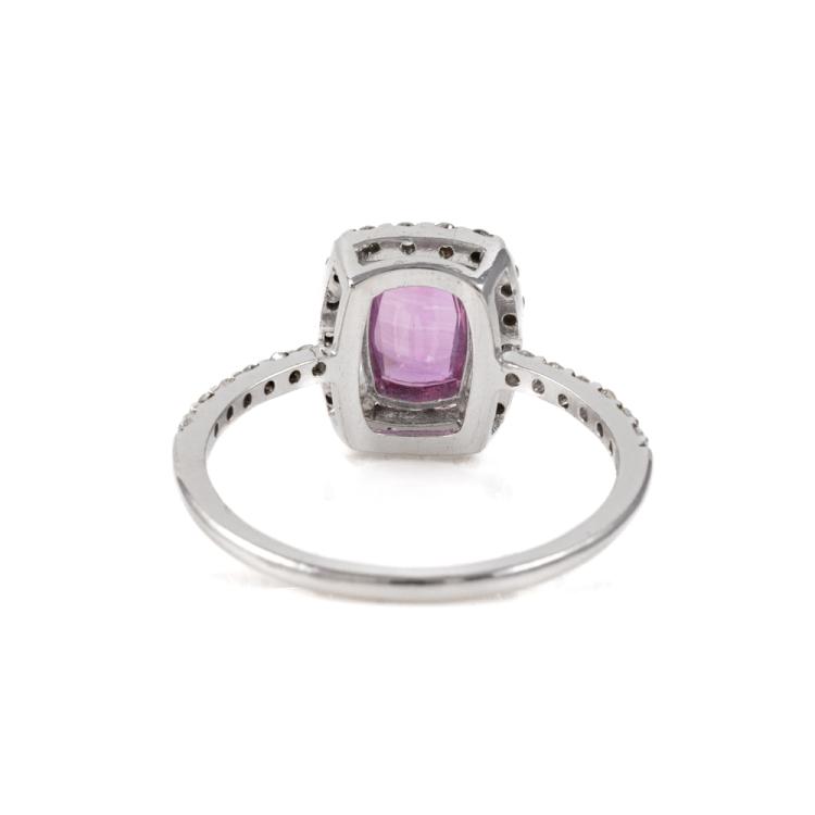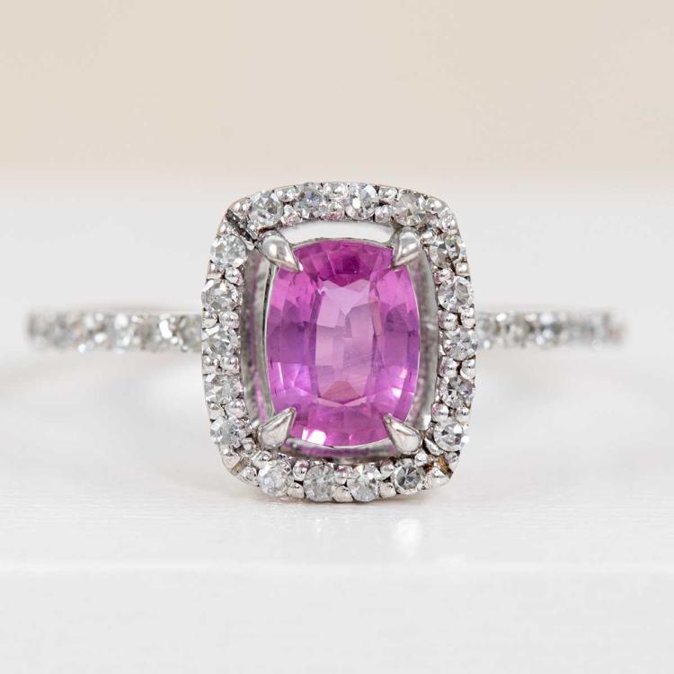 Sapphire and Diamond ring with a cushion cut unheated Ceylon Natural Padparadscha of 0.71ct and round Natural Diamonds totalling 0.42cts (Estimated grading: G SI). 14ct white gold. Ring size J. Band width: 1.2mm. Weight: 1.7g. With GGTL Report #206168. (As new)
