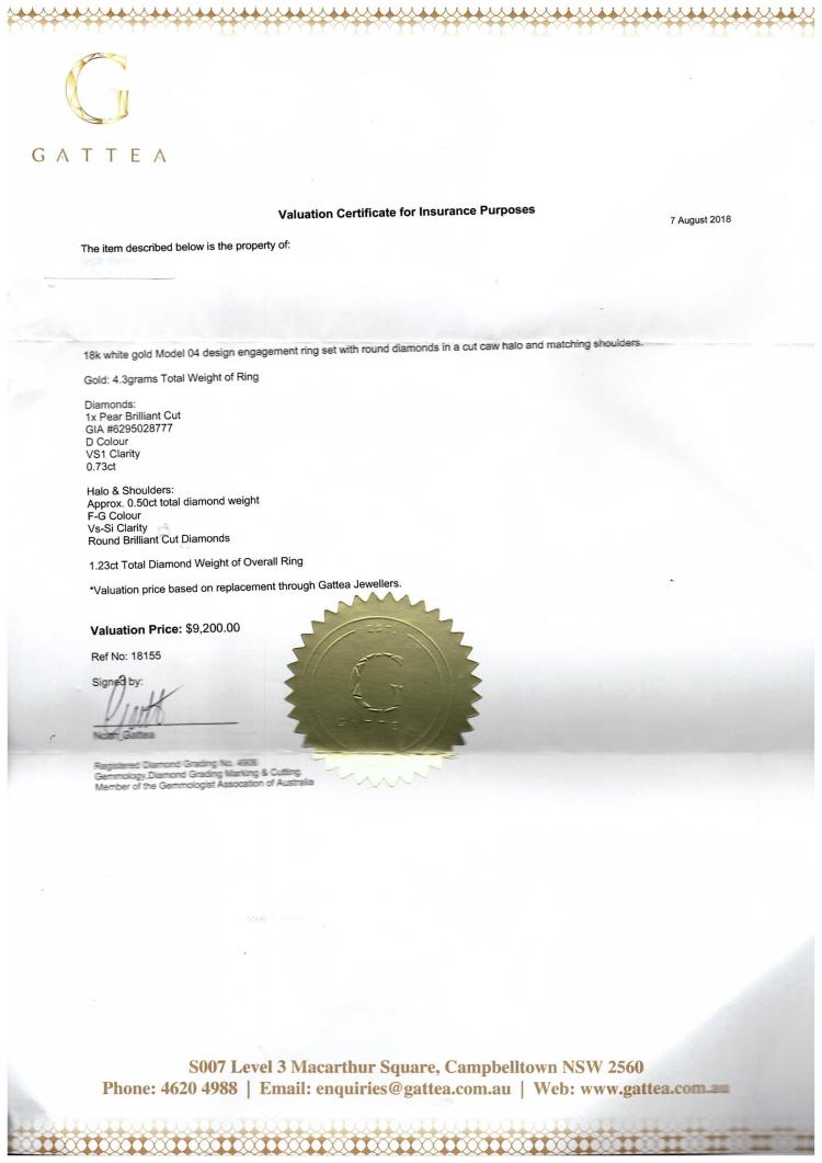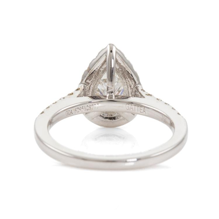 Diamond halo ring with a centre pear shape natural Diamond of 0.73ct (with GIA Diamond Dossier graded as D VS1 #6295028777) and remaining round natural Diamonds totalling 0.54cts (F-G VS-SI). 18ct white gold. Ring size K1/2. Band width: 1.6mm-1.9mm. Weight: 4.3g. With Gattea Valuation dated 07/08/18. Stamped "Gattea". (Pre-owned)