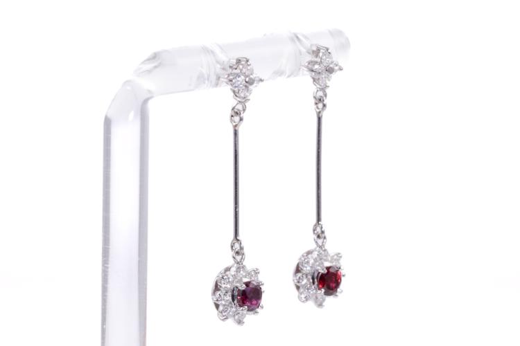 Ruby and Diamond earrings with natural Rubies (4.0mm x 3.5mm) totalling 0.75ct and natural Diamonds totalling 0.80ct (Estimated grading: G SI). Platinum 850. Item length: 35.0mm. Weight: 3.5g. (Pre-owned)