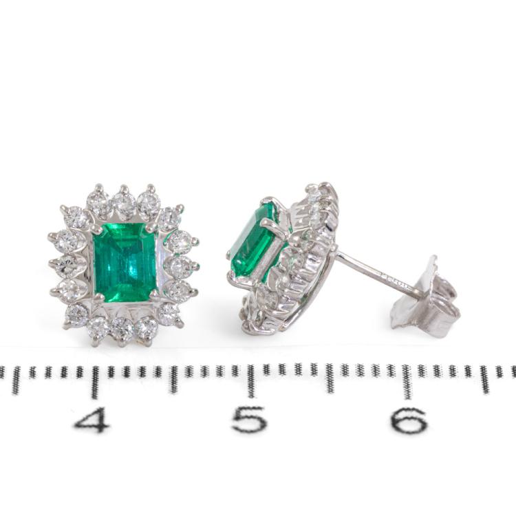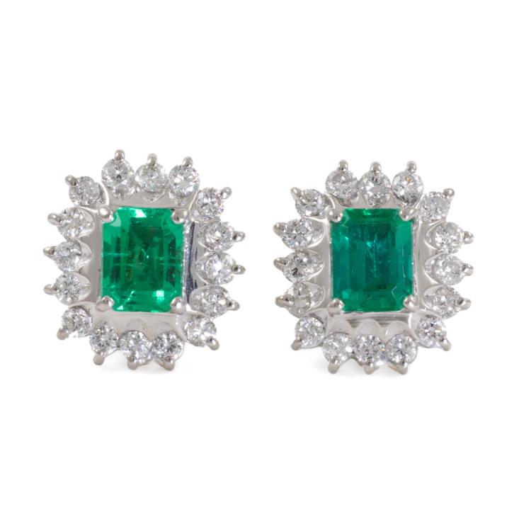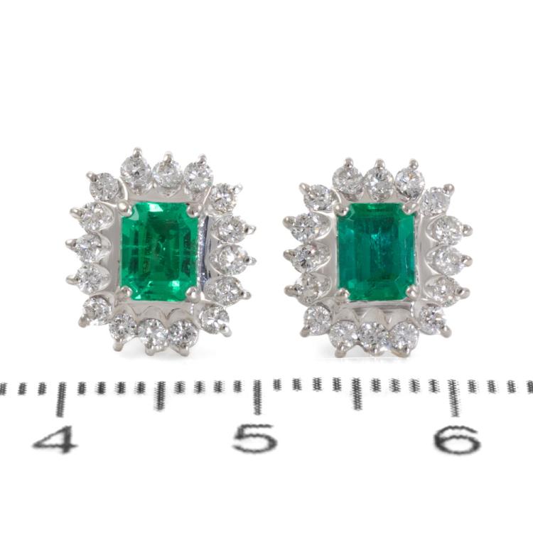 Emerald and Diamond earrings with emerald cut natural Emeralds totalling 0.76ct and round natural Diamonds totalling 0.49ct (Estimated grading: H-I, SI). Platinum 900 (XRF tested) and 18ct white gold backs. Weight: 4.4g. (pre-owned)