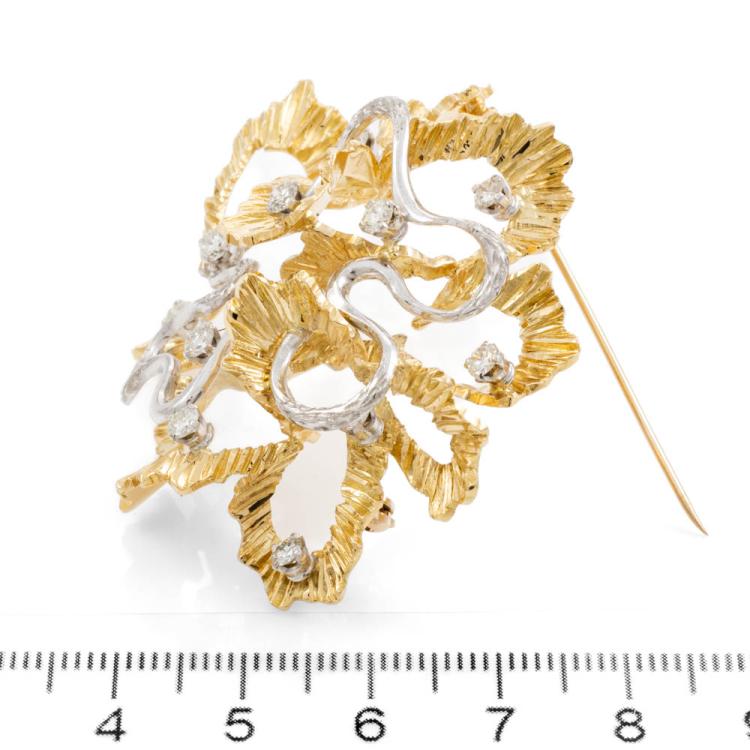 Diamond Brooch with 11 round Natural Diamonds totalling approximately 1.10cts (Estimated grading: H-I SI). 15ct Yellow & white gold - XRF tested, stamped 18ct. Weight: 22.2g. Note - safety chain attached to the pin is broken. (Pre-owned)