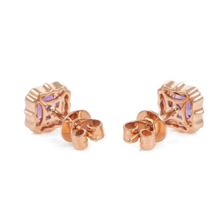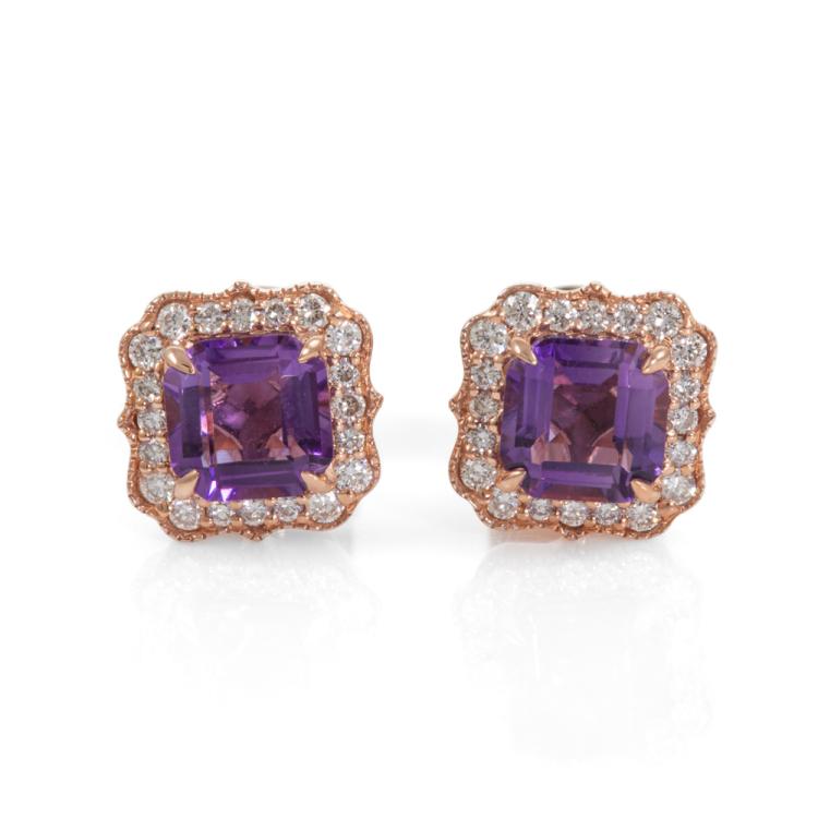 Amethyst and Diamond earrings with octagonal cut Natural Amethyst totalling 0.80cts and Natural round Diamonds totalling 0.15cts. 14ct rose gold. Weight: 1.7g. (New)