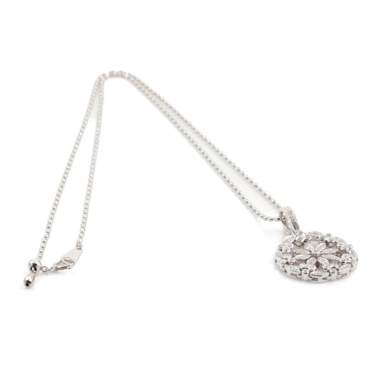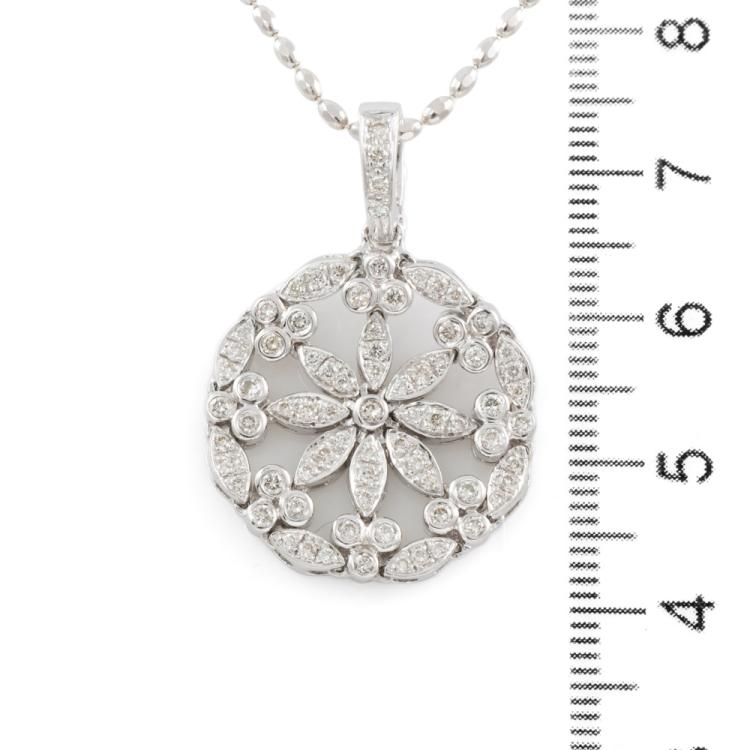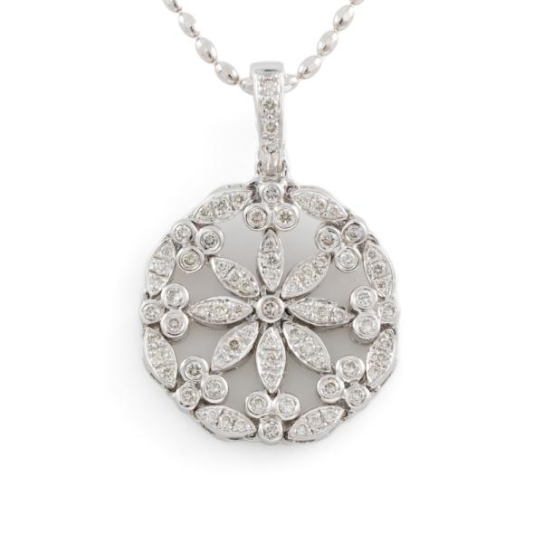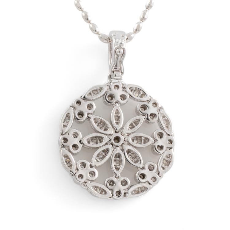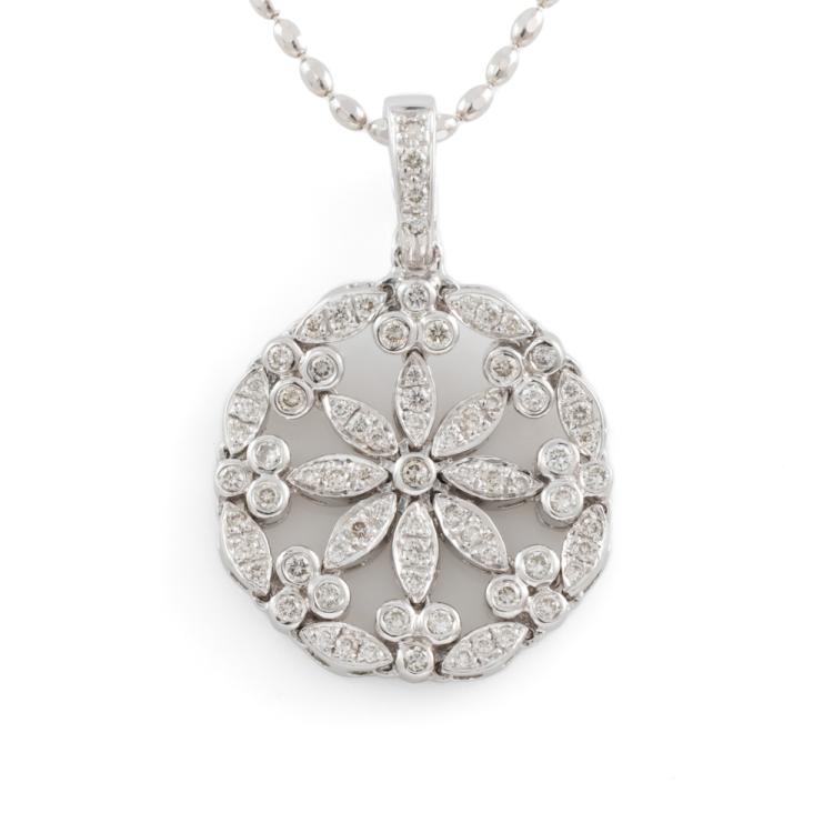 Diamond pendant/enhancer with round natural Diamonds totalling 0.80ct (Estimated grading: J SI). 18ct white gold with 18ct white gold adjustable max 50cm chain. Weight: 12.4g. (Pre-owned)