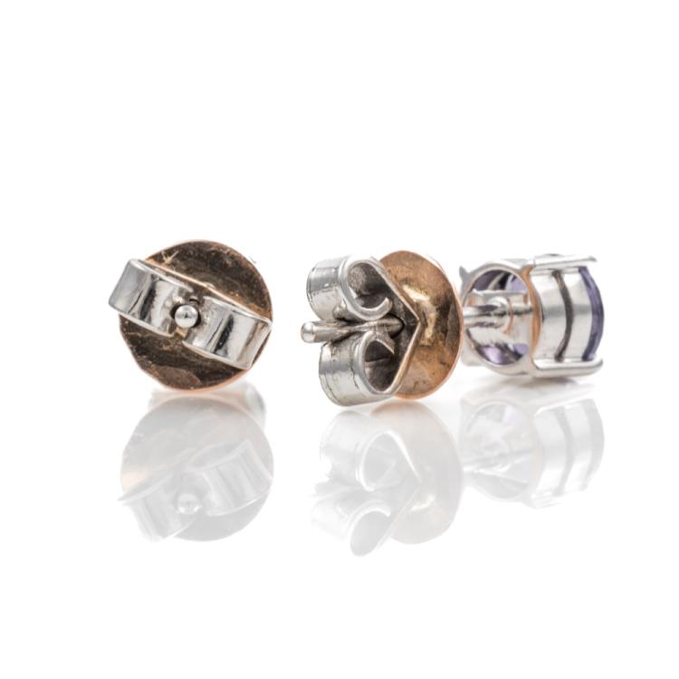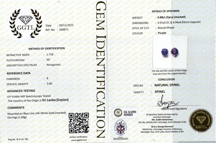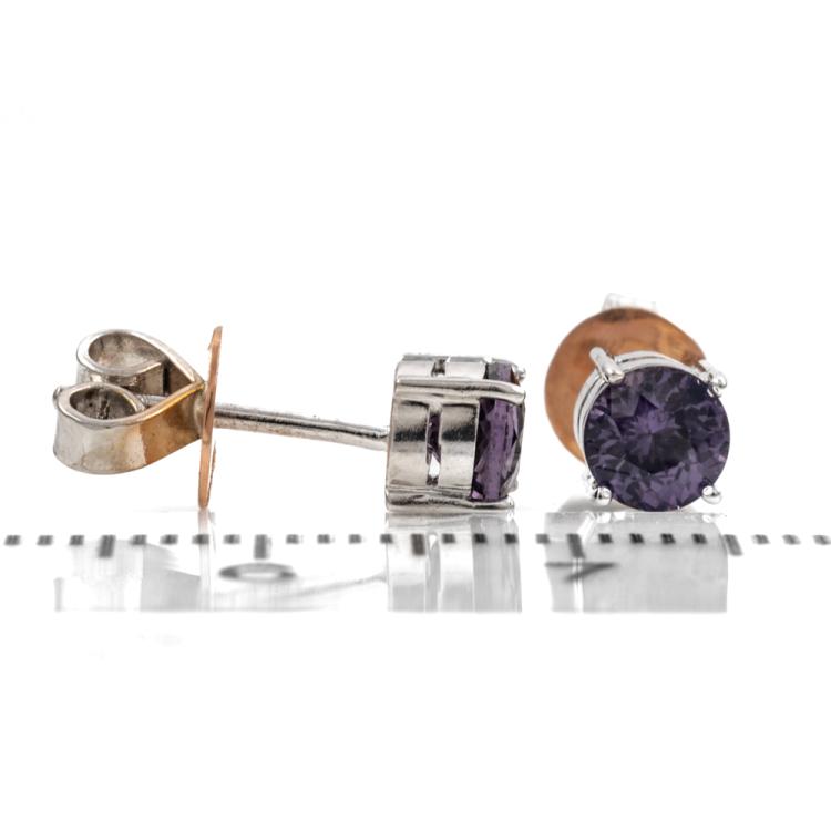 Spinel stud earrings with round purple Ceylon Natural Spinel totalling 0.88cts. 14ct white gold (note rhodium plating faded on backs). Weight: 1.6g. With GGTL report #200872. (As new)