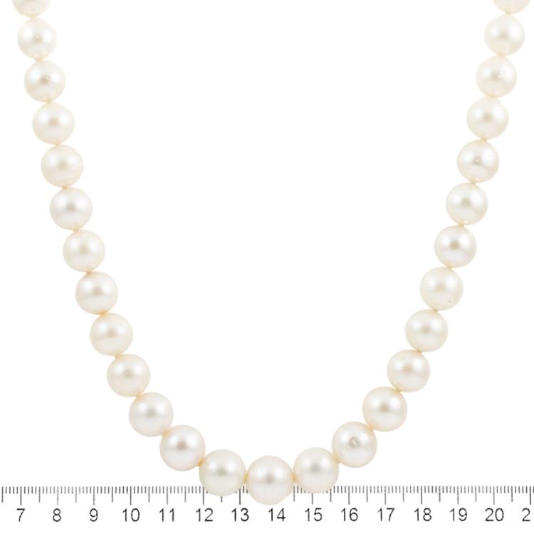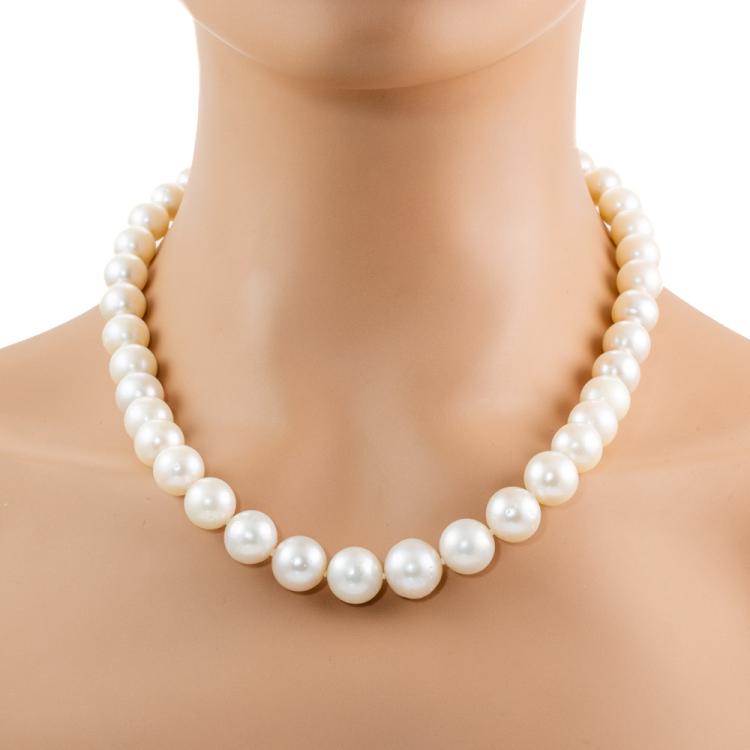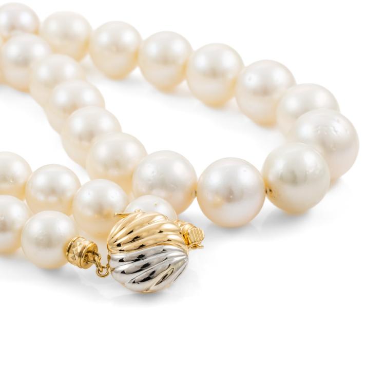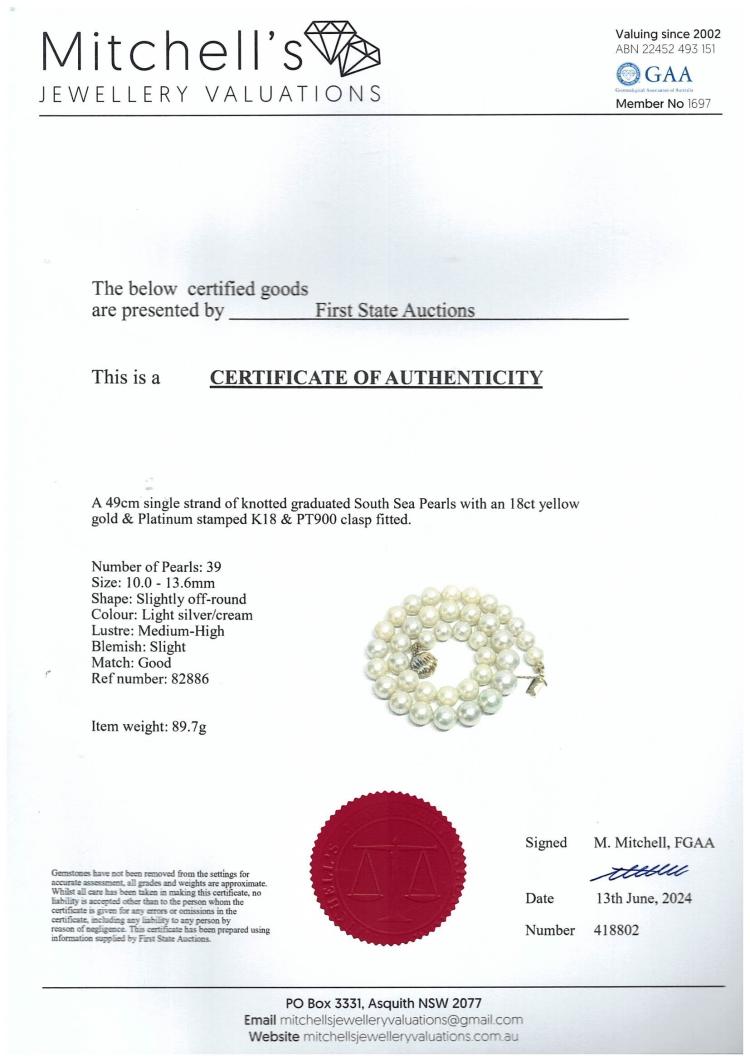 Pearl necklace with 39 graduated South Sea Pearls of 10.0mm-13.6mm. 18ct yellow gold and platinum 900 clasp. Length: 49m. Weight: 89.7g. With Certificate #418802. (Pre-owned)