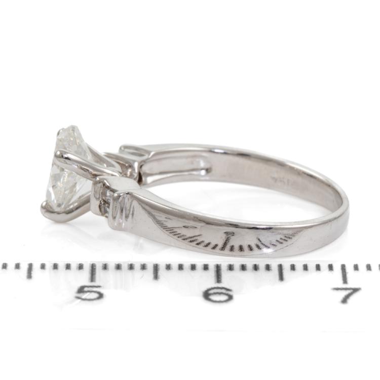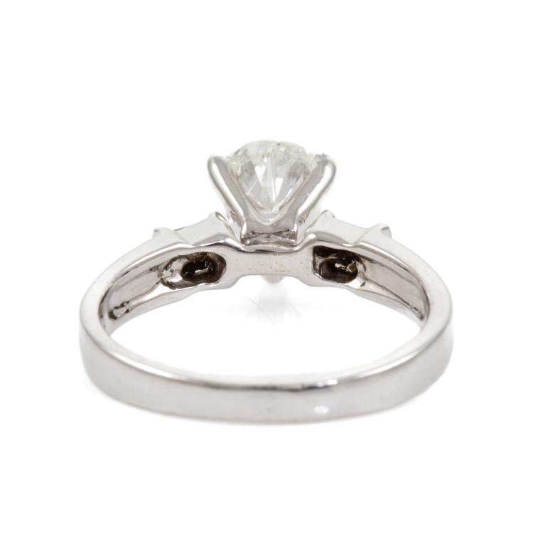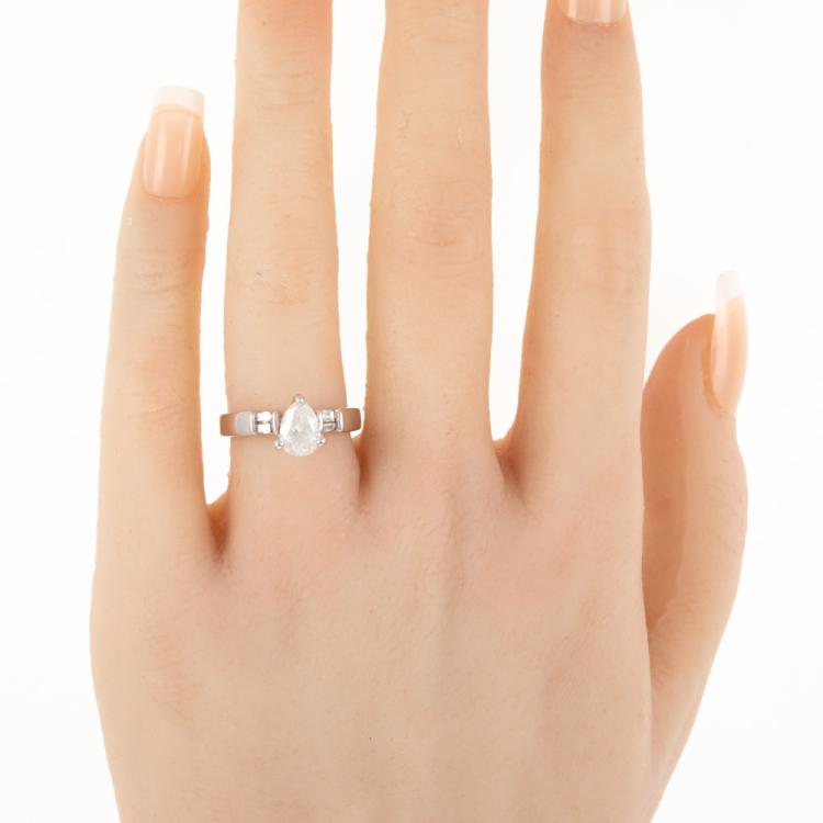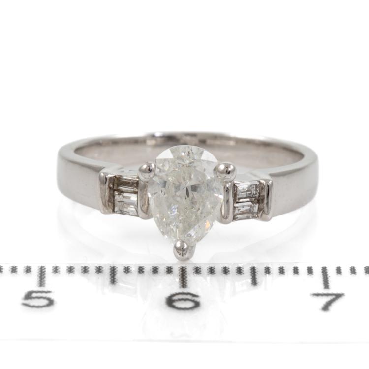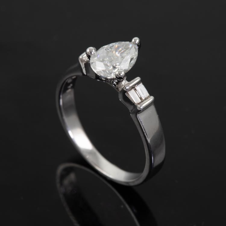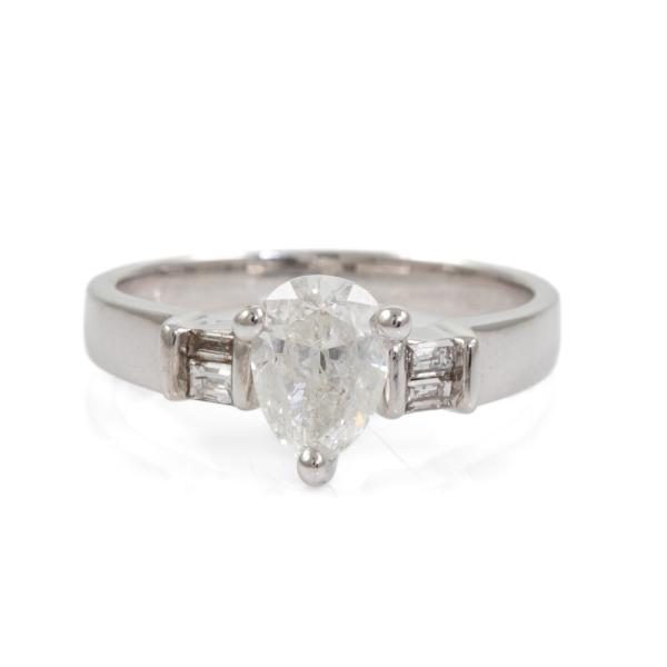 Diamond ring with a centre pear shape natural Diamond of approximately 1.00ct (Estimated grading: H-I P2) and 4 shoulder baguette cut natural Diamonds totalling approximately 0.14ct. 18ct white gold. Ring size L3/4. Band width: 2.2mm-3.5mm. Weight: 3.8g. (Pre-owned)
