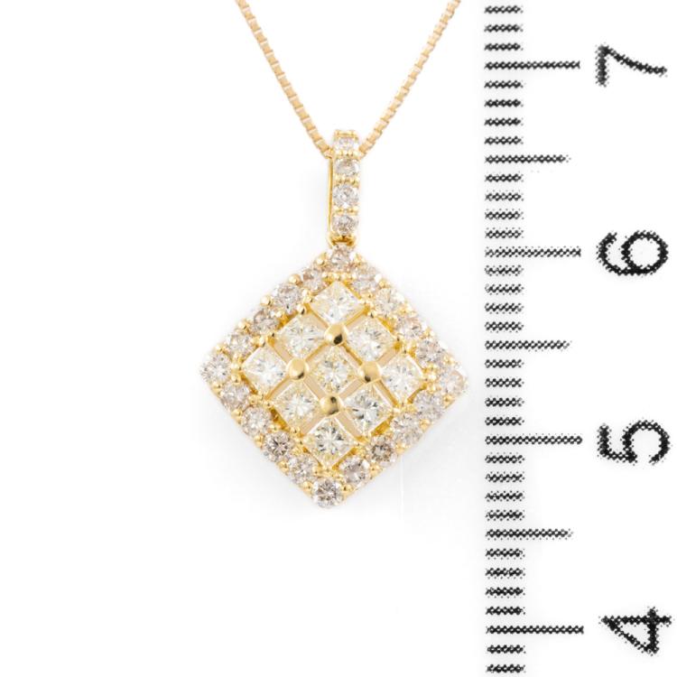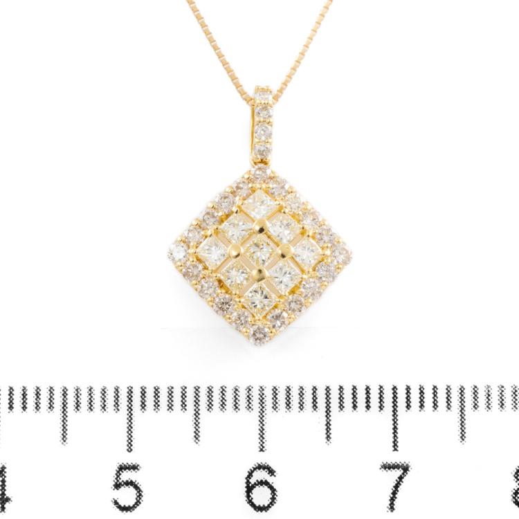 Diamond pendant with princess cut & round brilliant Natural Diamonds totalling 1.00ct (Estimated grading: J-K, L-M SI). 18ct yellow gold with 18ct yellow gold adjustable chain. Length: max 45.0cm. Weight: 2.7g. (Pre-owned)
