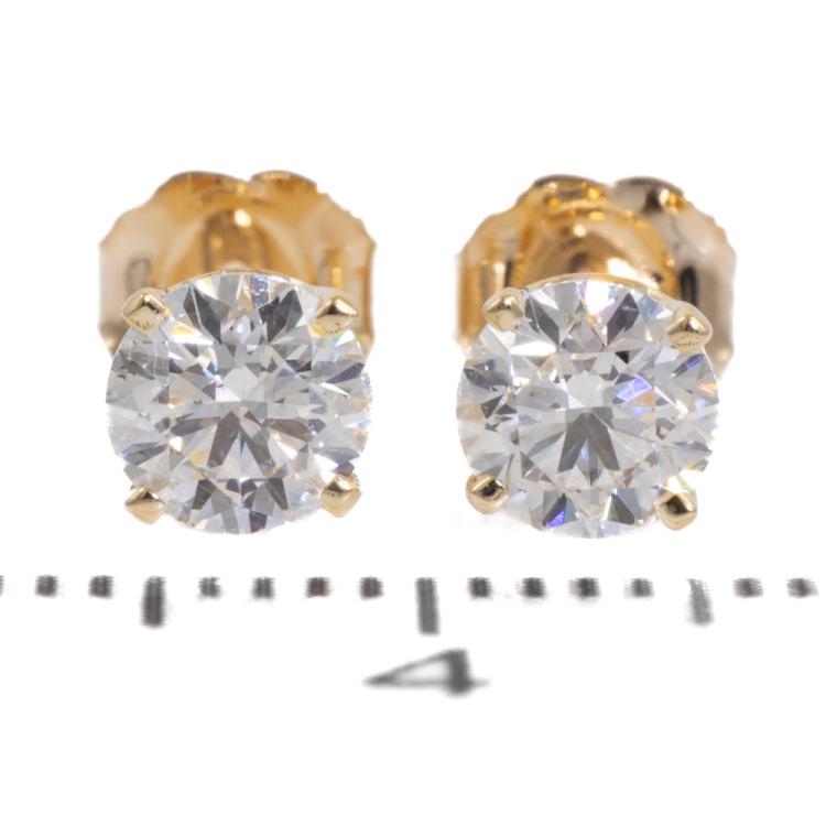 Diamond stud earrings with 2 round brilliant cut natural Diamonds totalling 1.00ct (with GIA Summary Reports graded as E SI2 & F SI1 #6491583569, 5493600328). 18ct yellow gold. Weight: 1.2g. (New)
