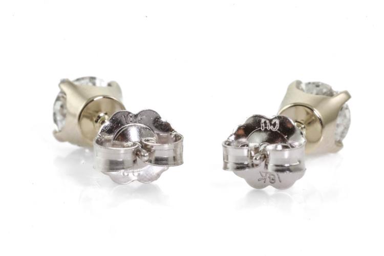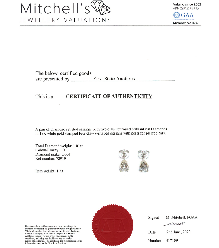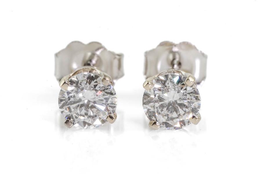 Diamond stud earrings with 2 round brilliant cut Natural Diamonds totalling 1.01cts (Estimated grading: F P1). 18ct white gold. Weight: 1.3g. With certificate #417109.