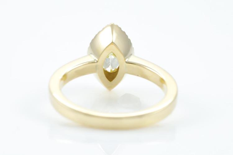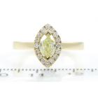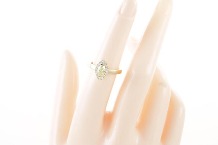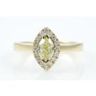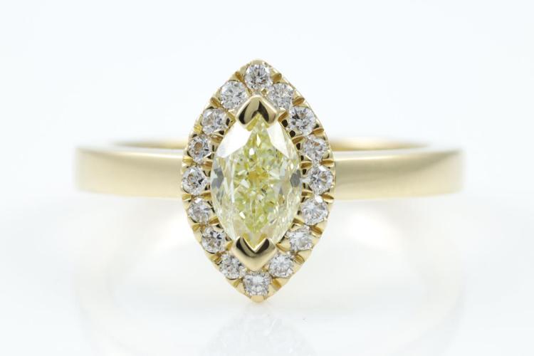 Diamond halo ring with centre marquise cut Natural Diamond of 1.00ct (with GIA report graded as Natural Fancy Light Yellow Even SI1 #1142899152) and surrounding round Diamonds totalling 0.21cts. 18ct yellow gold. Ring size L1/2. Weight 6.0g. (New)