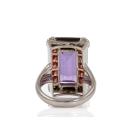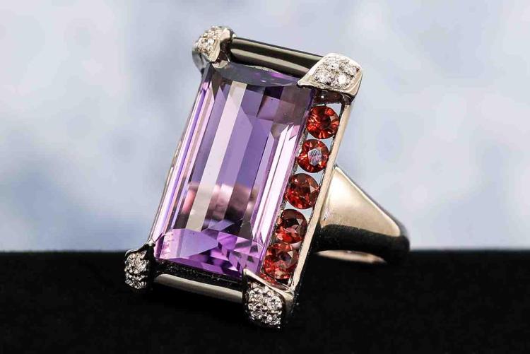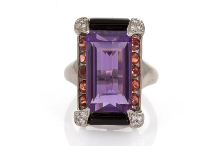 Natural Amethyst, Onyx and Diamond ring with fancy rectangular cut Amethyst of 10.26ct, Onyx totalling 3.91ct and round garnets totalling 1.20ct and round Diamonds totalling 0.10ct. 18ct white gold. Ring size M. Weight: 12.2g. (Pre-owned)