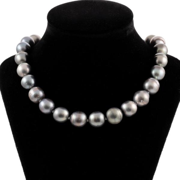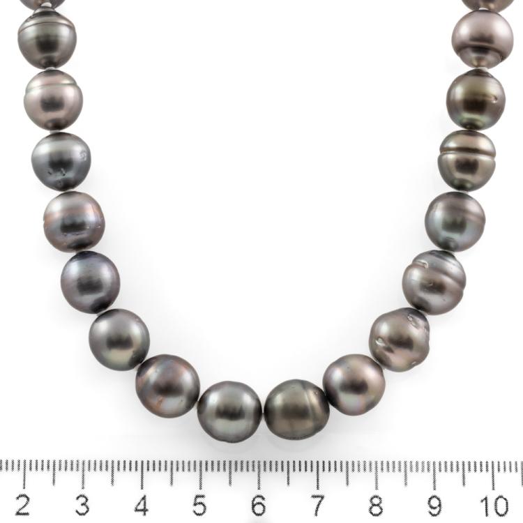 Pearl and Diamond necklace with semi-Baroque & ringed Tahitian Pearls of 10.3 - 10.9mm. 14ct white gold and Platinum 900 clasp set with round Natural Diamonds totalling 0.04ct. Length: 47.0cm. Weight: 68.5g. (Pre-owned)