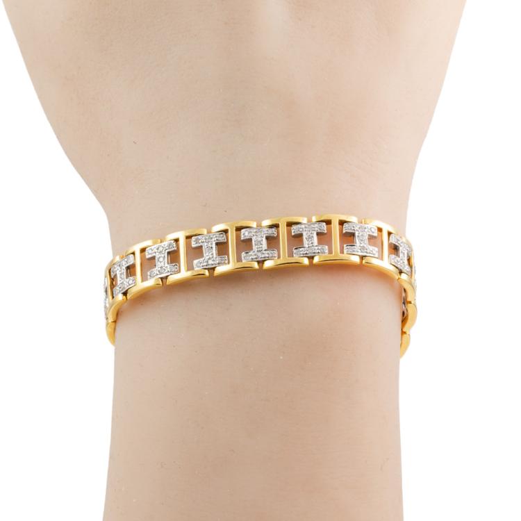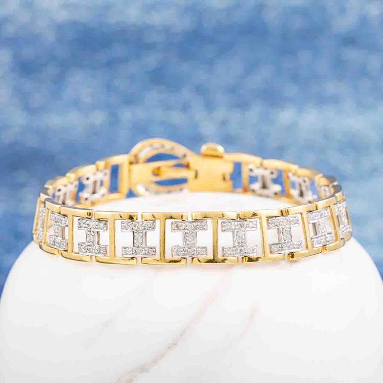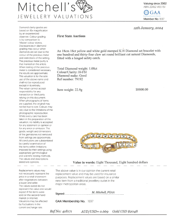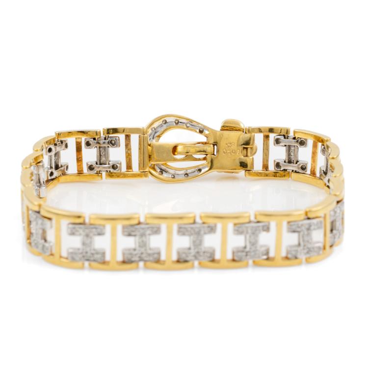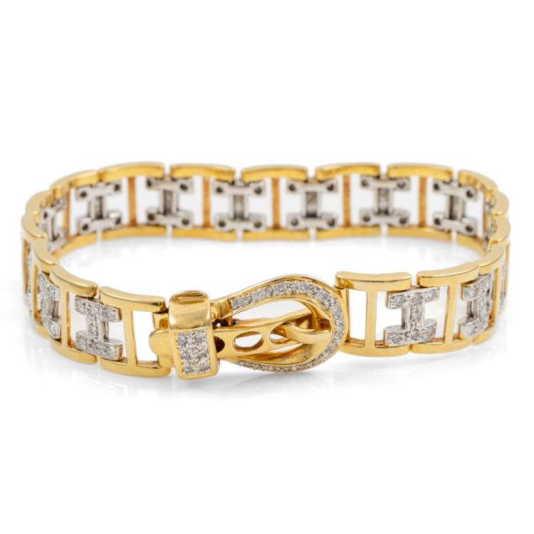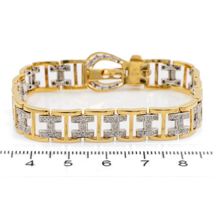 Diamond bracelet with round Natural Diamonds totalling 1.08cts (Estimated grading: H-I SI). 18ct yellow and white gold. With buckle style clasp. Length: 18cm. Weight: 22.9g. With Valuation Certificate #418171. (Pre-owned)