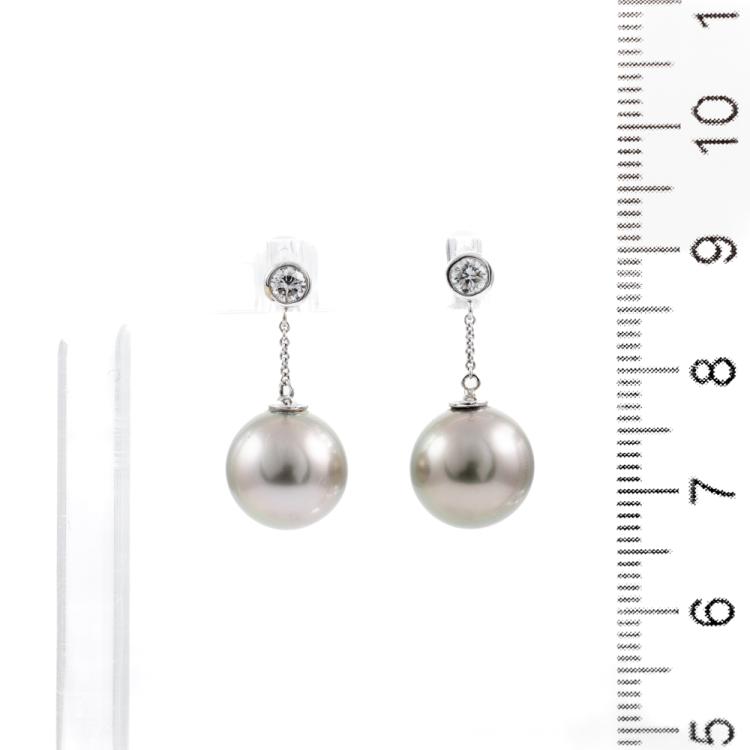 Pearl and Diamond earrings with 2 Tahitian Pearls of 10mm and round Natural Diamonds totalling approximately 0.20cts. 18ct white gold with 18ct white gold & silicon backs. Weight: 4.0g. (Pre-owned).