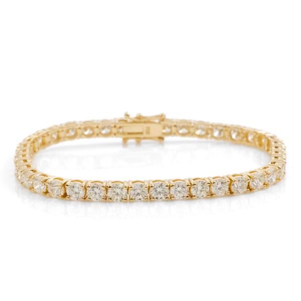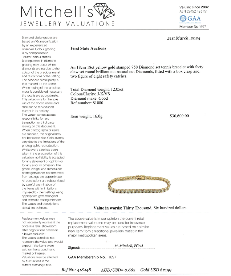 Diamond tennis bracelet with 40 round brilliant cut Natural Diamonds totalling 12.05cts (Estimated grading: J-K VS). 18ct yellow gold. Length: 18cm. Weight: 16.0g. With Valuation Certificate #418448. (New)
