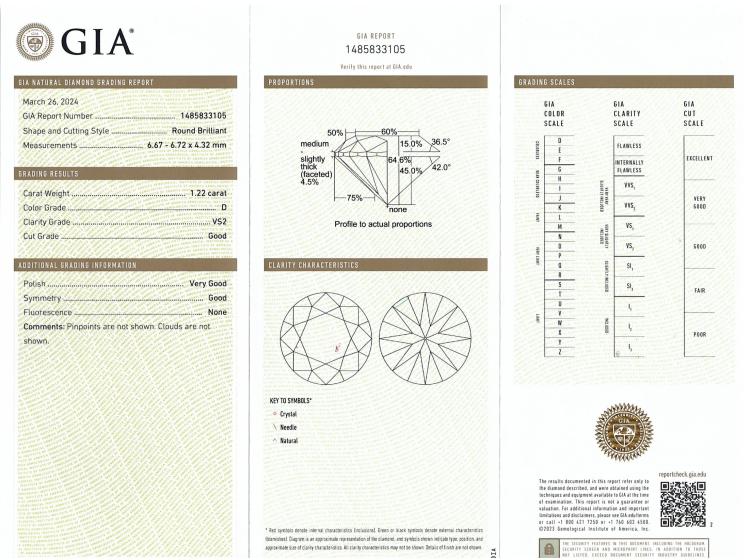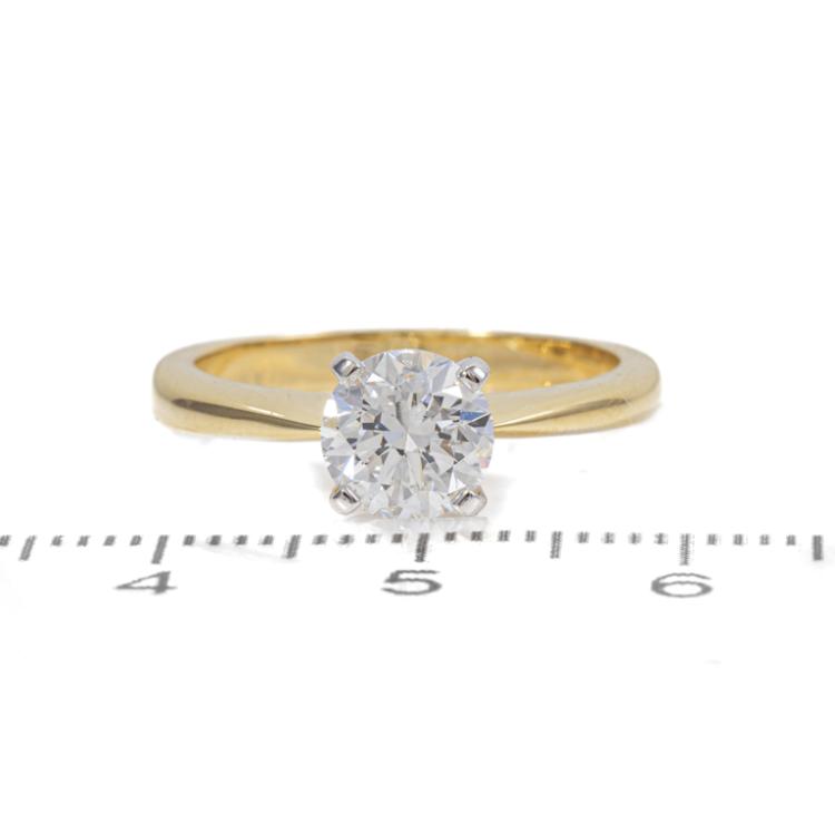 Diamond solitaire ring with round brilliant cut natural Diamond of 1.22ct (with GIA Report graded as D VS2 #1485833105). 18ct yellow and white gold. Ring size M. Band width 2.5mm - 1.7mm. Weight: 4.3g. (New)