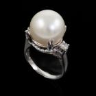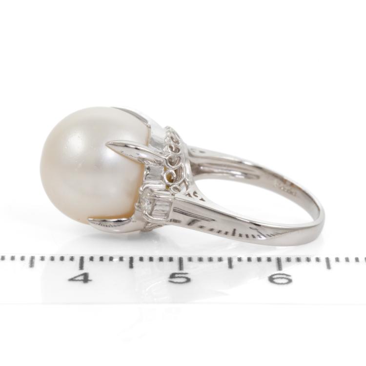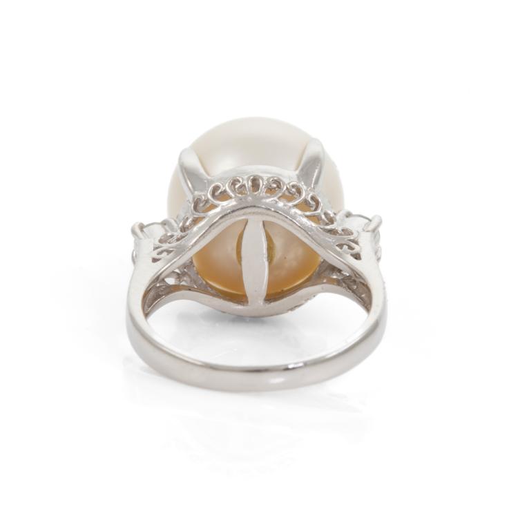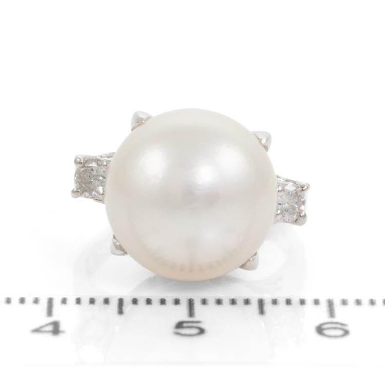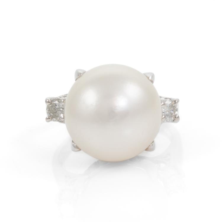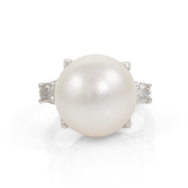 Pearl & Diamond ring with a white South Sea Pearl of 12.4mm and 2 round natural Diamonds totalling 0.20ct. Platinum 900. Ring size H. Band width 2mm-3.1mm. Weight: 8.2g. (Pre-owned).