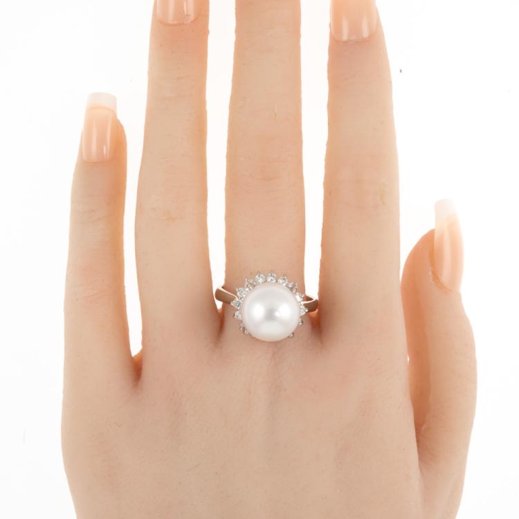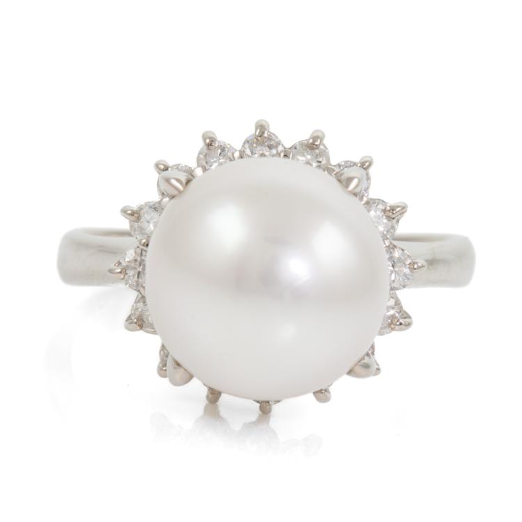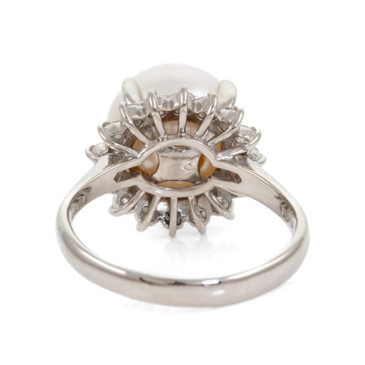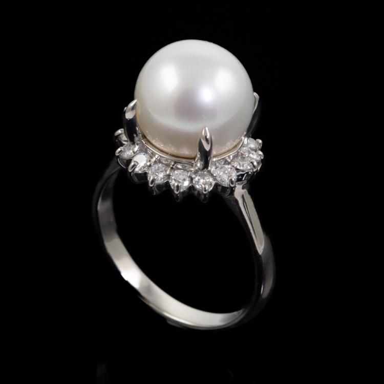 South Sea Pearl and Diamond ring with white South Sea Pearl of 12.4mm and Natural Diamonds totalling 0.66cts (Estimated grading: H-I P1). Platinum 900. Ring size T. Band width: 2.8mm - 2.6mm. Weight: 11.5g. (Pre-owned)