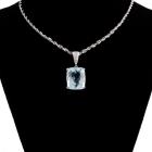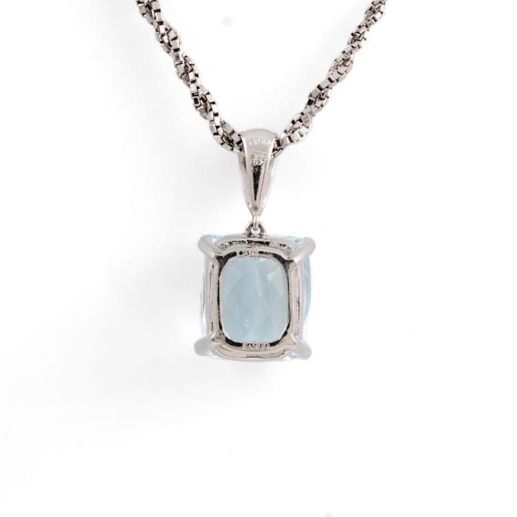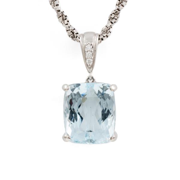Aquamarine and Diamond pendant with a cushion cut Natural Aquamarine of 12.91ct (note minor wear marks on stone) and 3 round Natural Diamonds totalling 0.07cts. Platinum 900 with platinum 850 45cm chain. Weight: 14.5g. (Pre-owned)