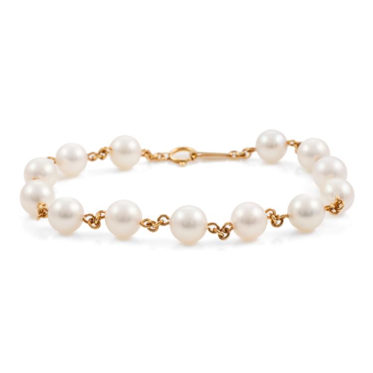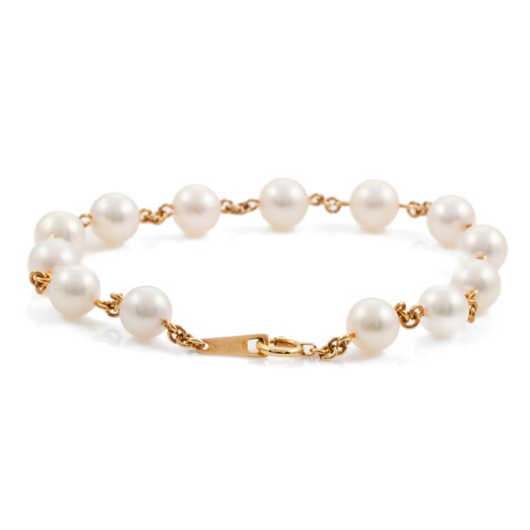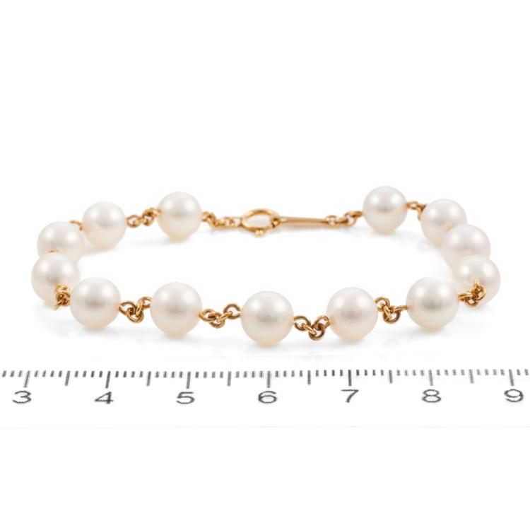 Pearl bracelet with 13 Akoya Pearls of 6.5mm - 6.8mm. 18ct yellow gold. Length: 18cm. Weight: 7.4g. (Pre-owned)