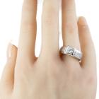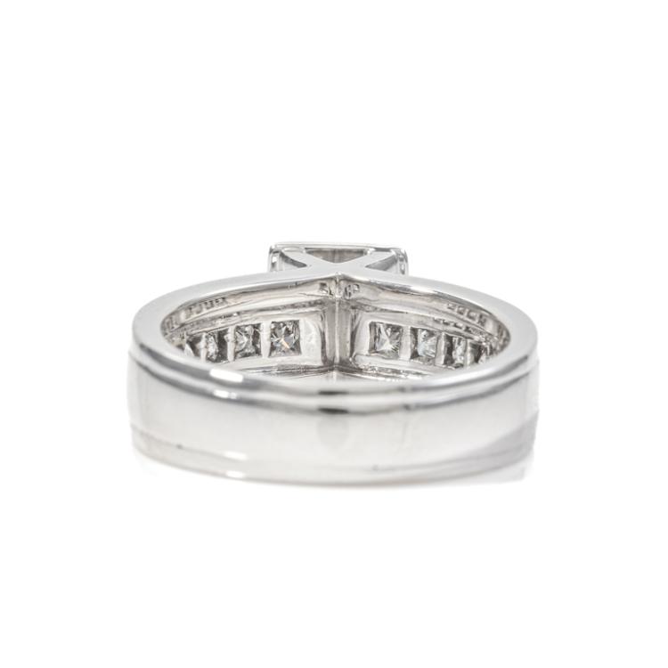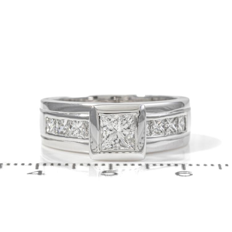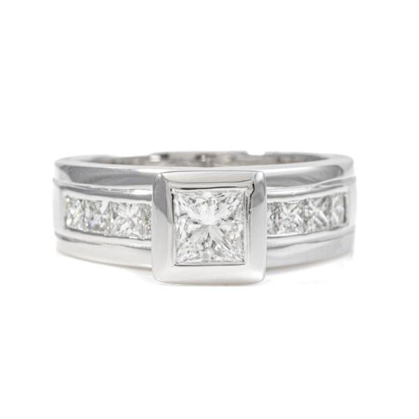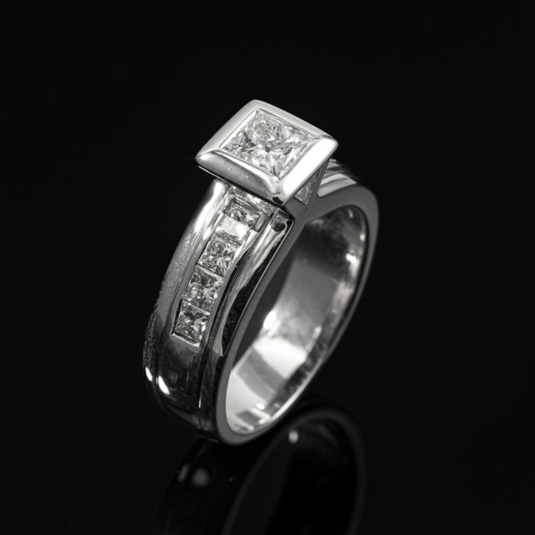 Diamond ring with a centre princess cut Natural Diamond of 0.50ct (Estimated grading: G SI ) and 8 shoulder princess cut Natural Diamonds totalling 0.80ct (Estimated grading: G-H SI). 18ct white gold. Ring size P. Band width: 5.5mm-6.9mm. Weight: 11.8g. (Pre-owned)