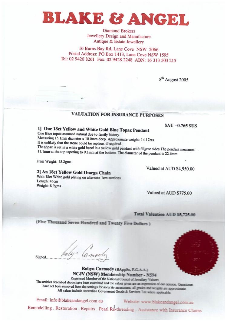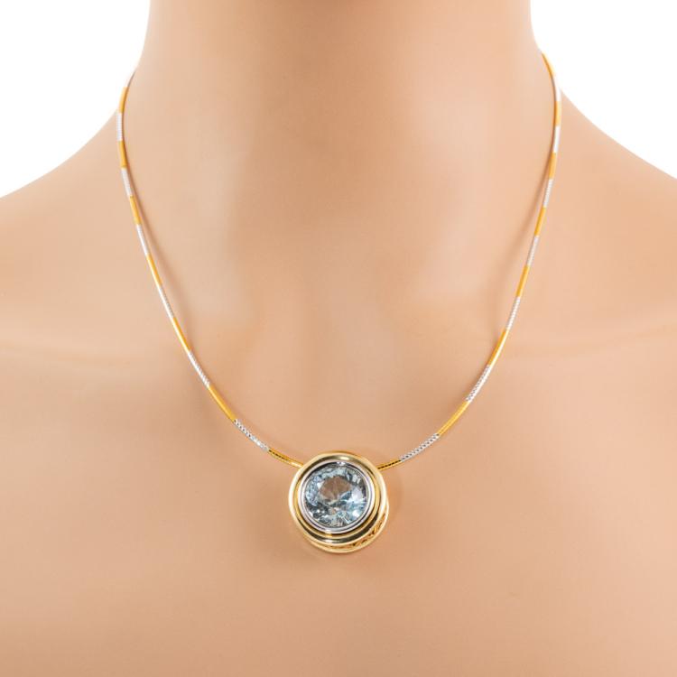Topaz pendant with round bezel set natural blue Topaz of approximately 14.17ct. 18ct yellow & white gold with 45.5cm 18ct yellow & white gold Omega chain. Weight: 24.2g. With Valuation Certificate dated 08/08/2005. (Pre-owned)