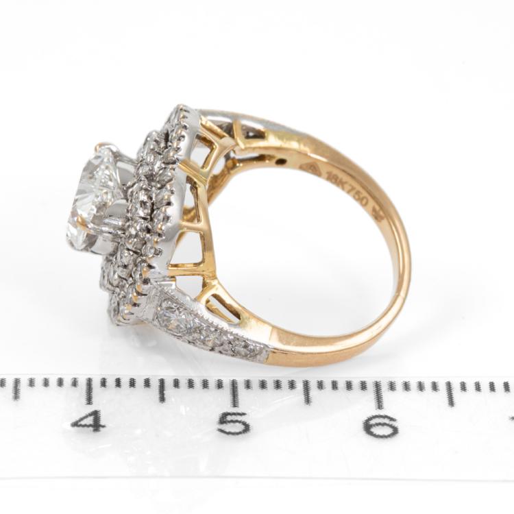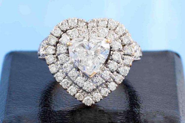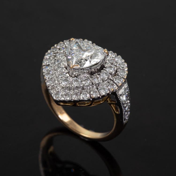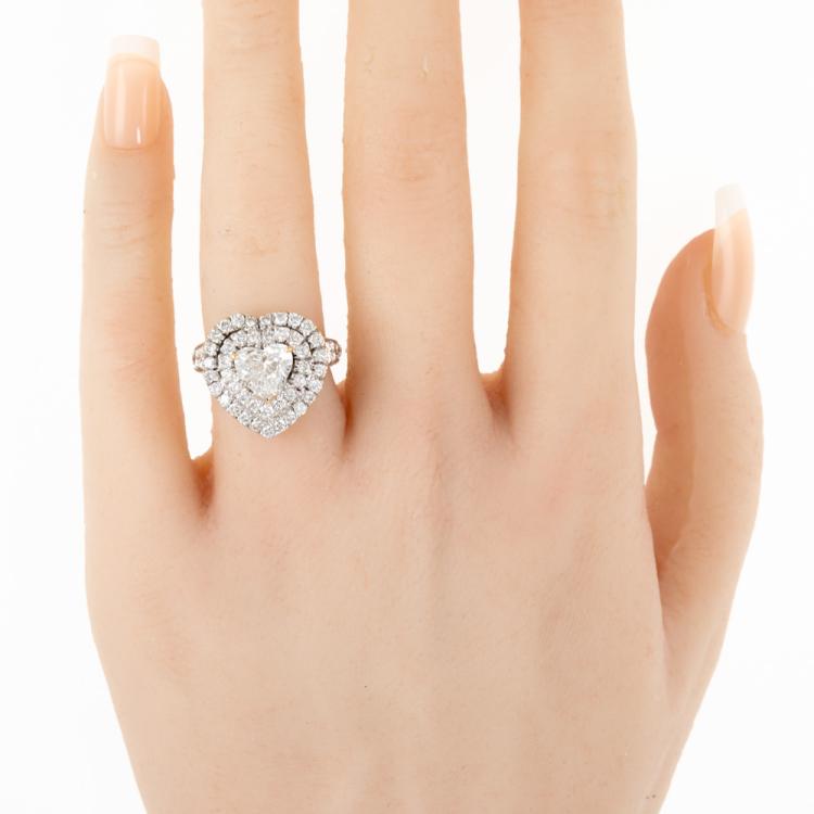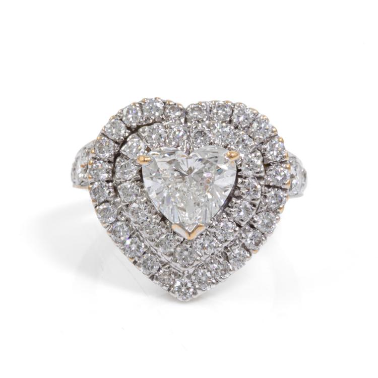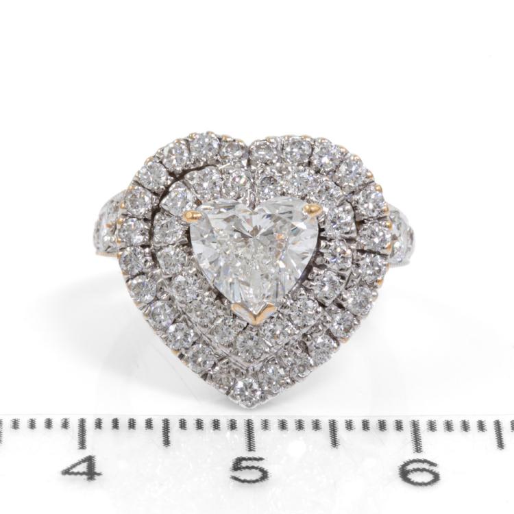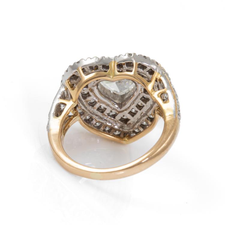 Diamond ring with a centre heart shape natural Diamond of 1.42ct (with GIA Report graded as H SI1 #1189656304) and remaining round natural Diamonds totalling approximately 1.40ct (Estimated grading: G-H VS-SI). 18ct yellow & white gold. Ring size I. Band width: 1.9mm-2.5mm. Weight: 6.5g. (Pre-owned)
