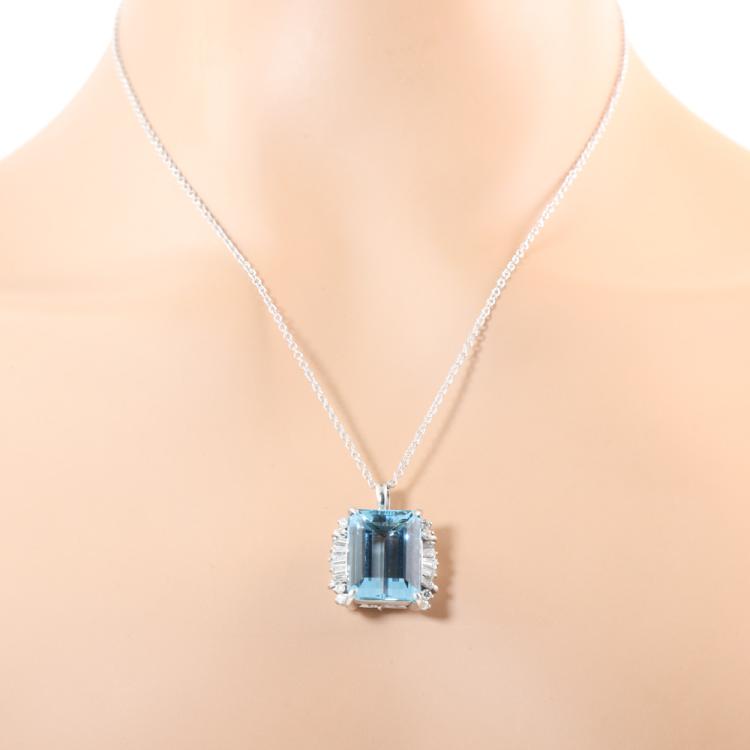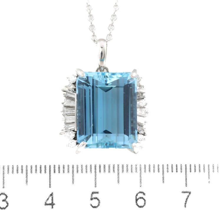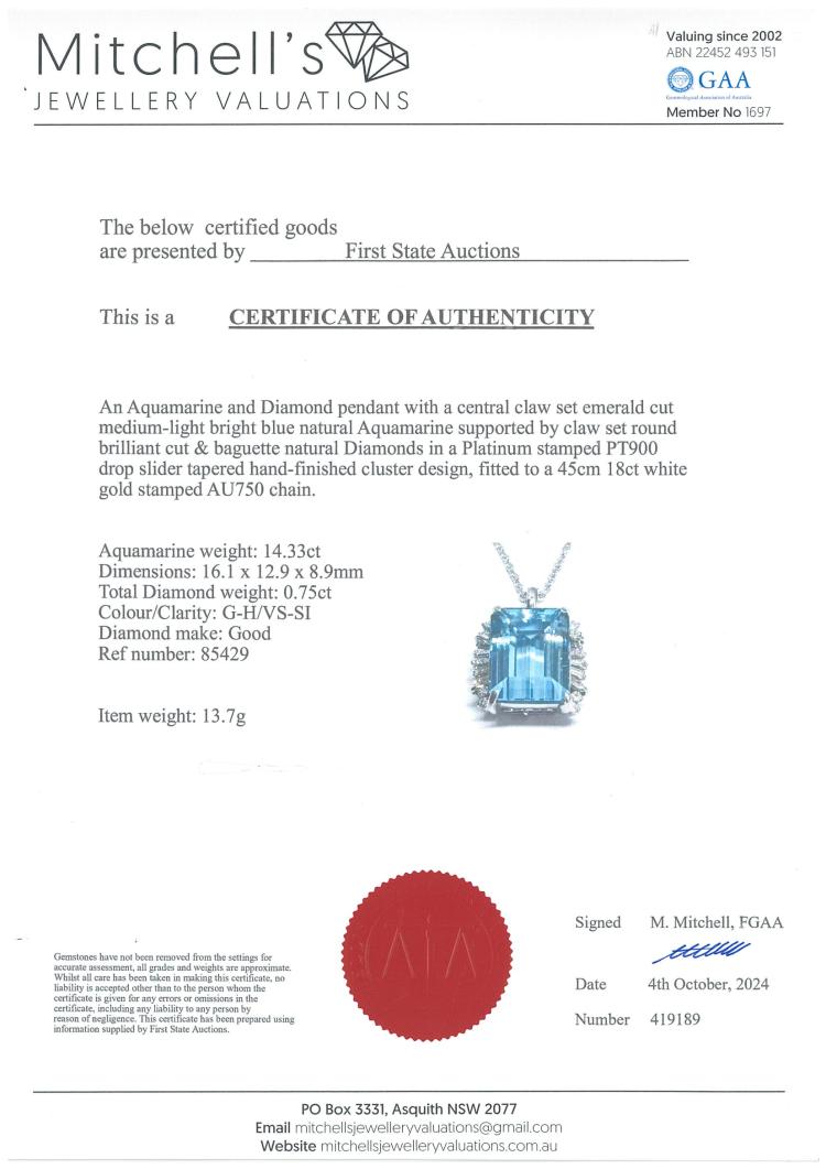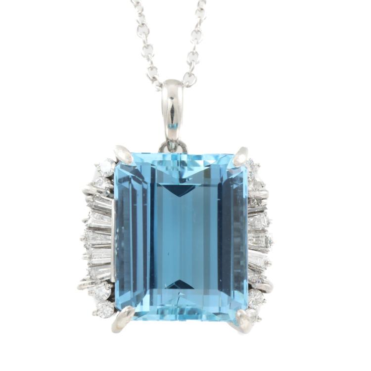 Aquamarine and Diamond pendant with emerald cut natural Aquamarine of 14.33ct and round & baguette cut natural Diamonds totalling 0.75ct (Estimated grading: G-H VS-SI). Platinum - 900 with 45cm 18ct white gold chain. Weight: 13.7g. With Certificate #419189. (Pre-owned)