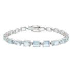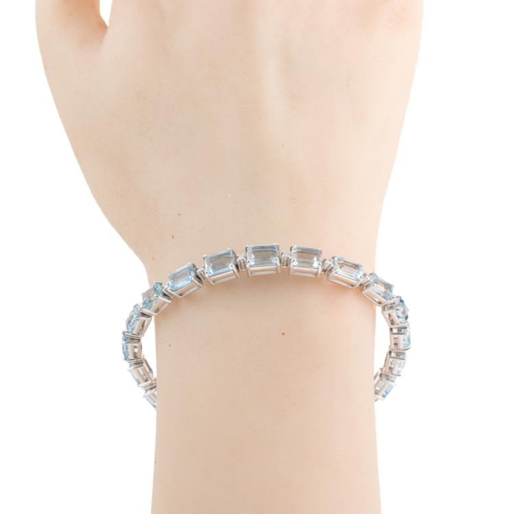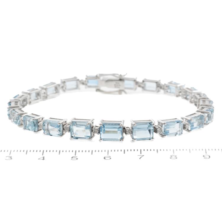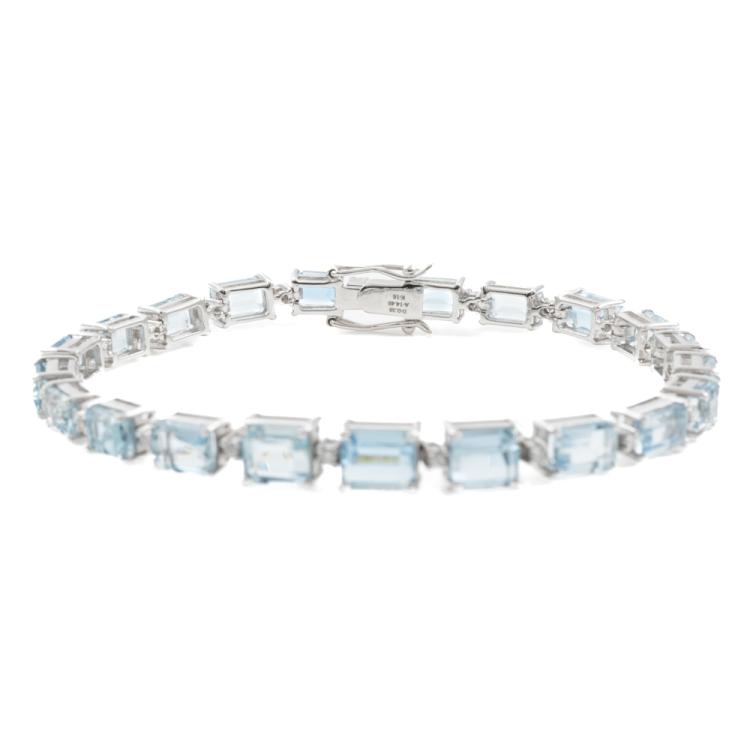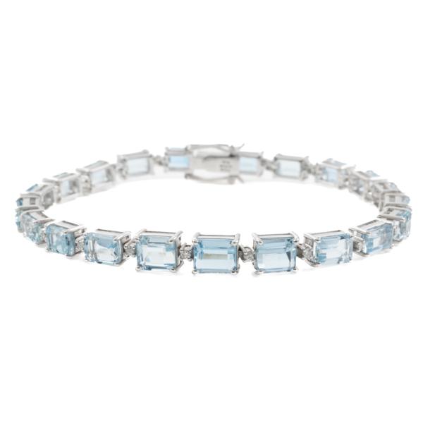 Aquamarine and Diamond bracelet with emerald cut natural Aquamarines totalling 14.48ct and round natural Diamonds totalling 0.38ct (Estimated grading: G-H SI). 18ct white gold. Length: 18.5cm. Weight: 17.1g. With Certificate #418911. (Pre-owned)