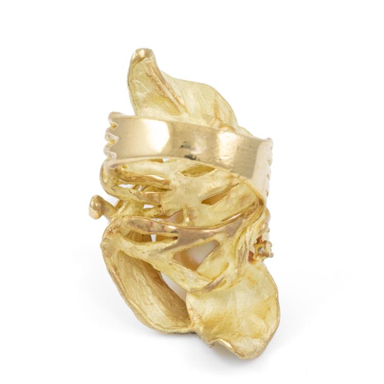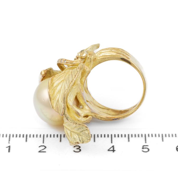 Pearl and Diamond ring with South Sea Pearl of 14.6mm and round natural Diamonds totalling 0.10ct. 18ct yellow gold. Ring size M. Band width: 4.6mm - 7.8mm.. Weight: 24.3g. With Certificate #418686. (Pre-owned)