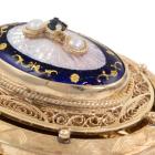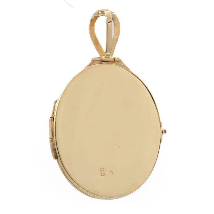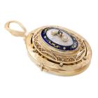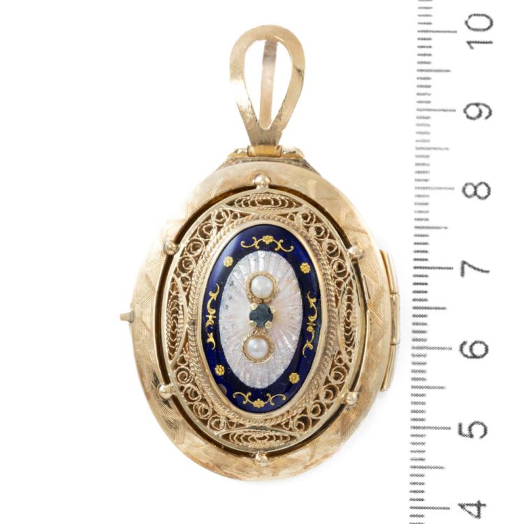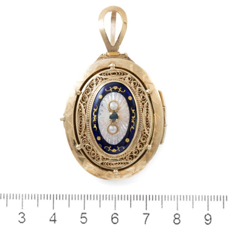 Locket pendant with enamel, seed pearls of 2.5mm and a round natural blue sapphire of approximately 0.07ct. 14 yellow gold. Size including bail: 5.6cm x 3.3cm. No chain provided. Weight: 25.0g. (Pre-owned)