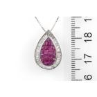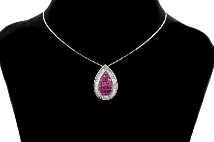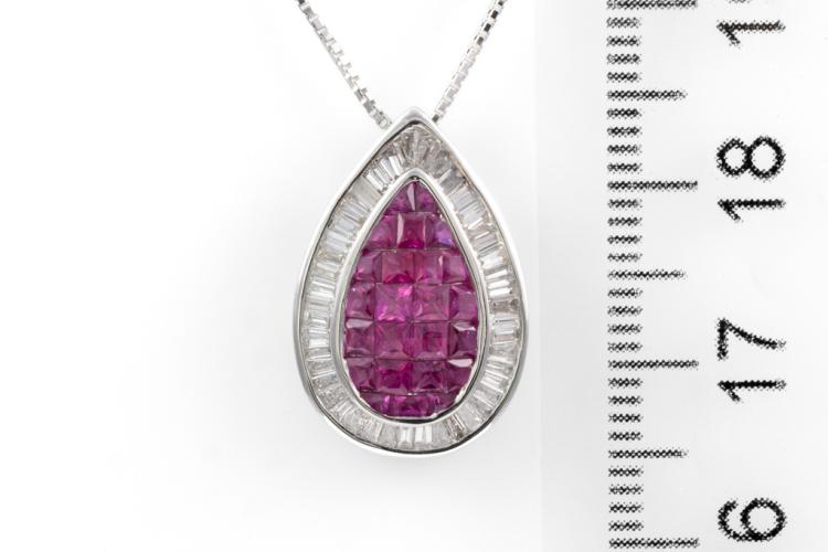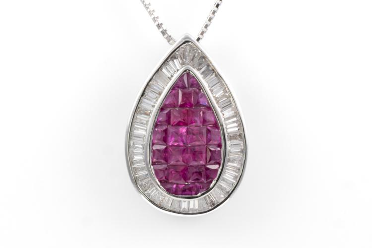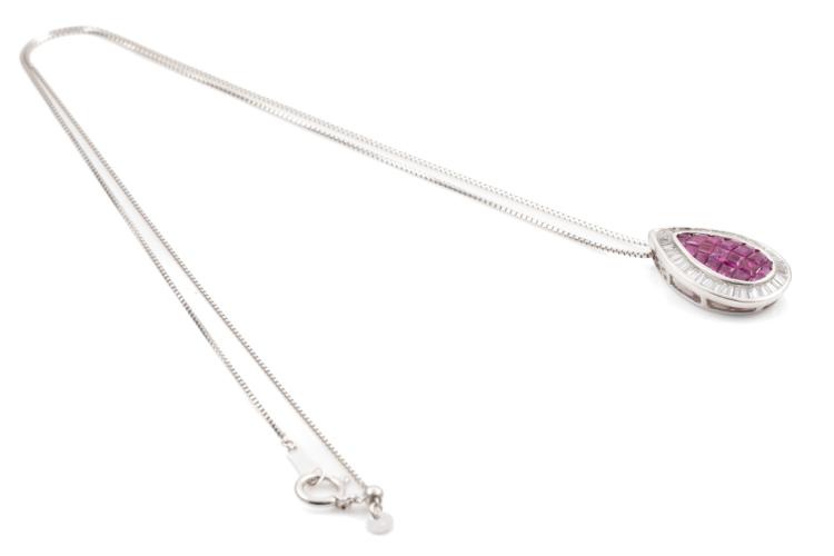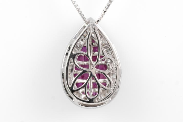 Ruby and Diamond Pendant with carre cut Natural Rubies totalling 1.50cts and Natural Diamonds totalling 0.65cts (Estimated grading: G VS-SI). 18ct white gold with 18ct white gold adjustable 44cm chain. Pendant Dimensions: 19.0mm x 13.0mm. Weight: 4.8g. (Pre-owned)