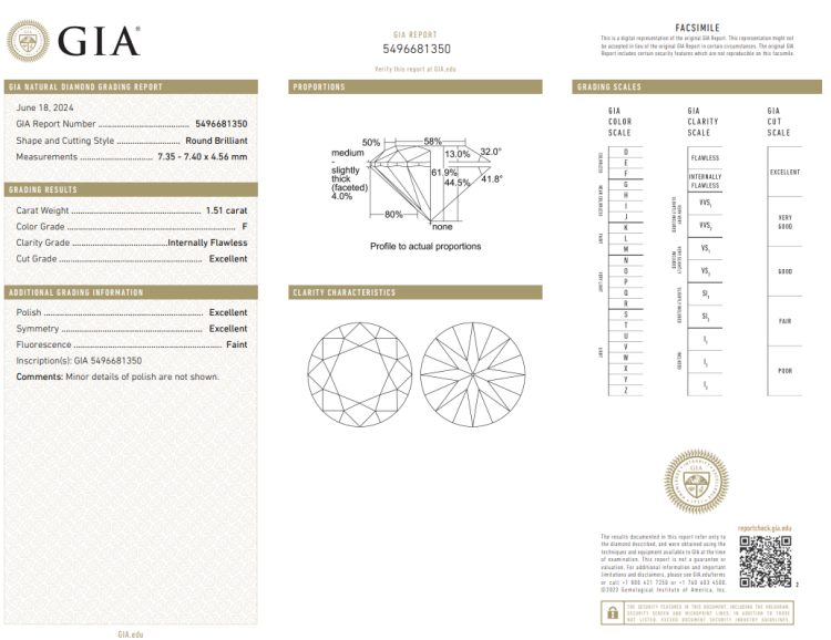 A loose round brilliant cut Natural Diamond of 1.51ct (with GIA report graded as F Internally Flawless #5496681350). (New)