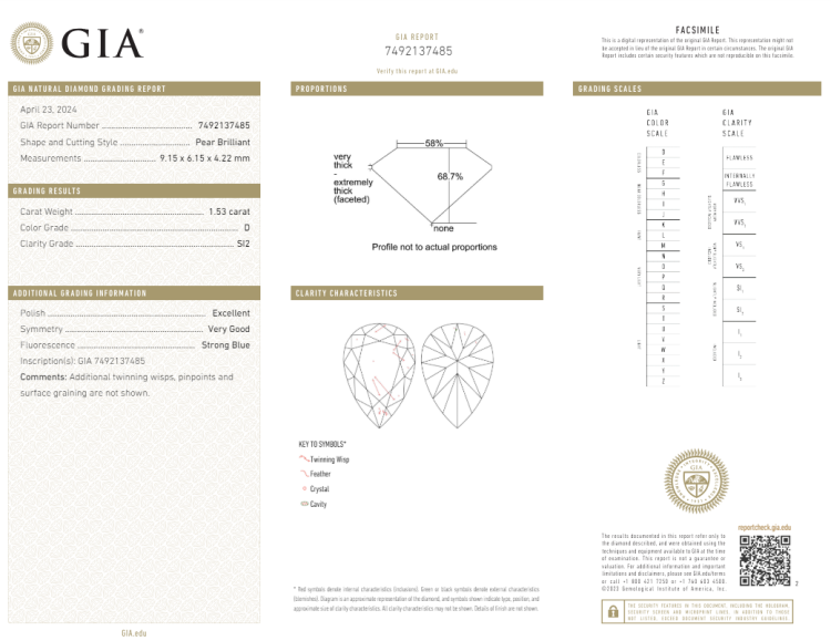 A loose pear shape Natural Diamond of 1.53ct (with GIA report graded as D SI2 #7492137485). (New)