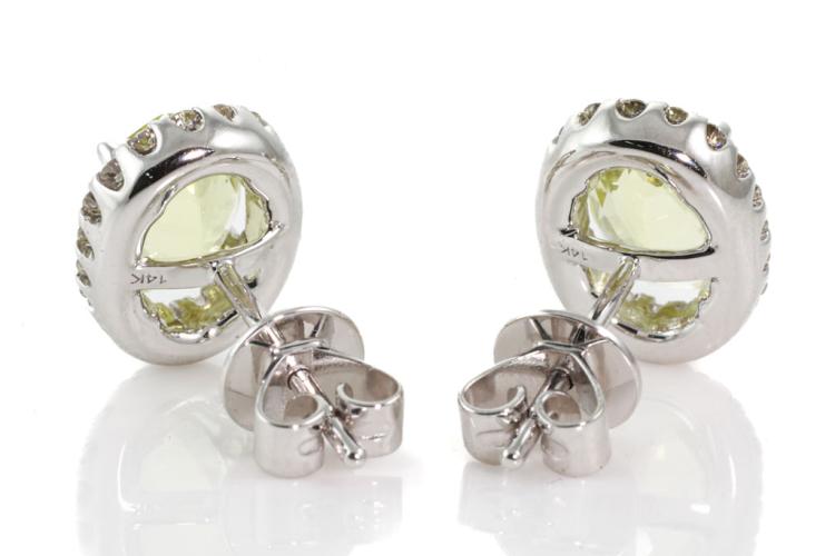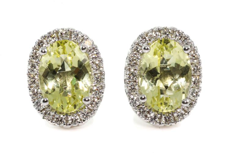Lemon Quartz and Diamond earrings with oval checkerboard cut Lemon Quartz totalling 1.57ct and Diamonds totalling 0.27ct. 14ct white gold. Weight: 2.5g. (New)^