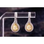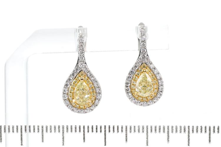 Yellow and White fancy colour Diamond clip-on earrings (for pierced ears) with 2 pear shape Fancy Yellow natural Diamonds totalling 1.03cts (Estimated grading: Fancy Light Yellow SI) and remaining round natural Diamonds totalling 0.64cts (Estimated grading: Fancy Light Yellow & G-H SI). 18ct yellow and white gold. Weight: 5.3g. With certificate #417189. (As new)