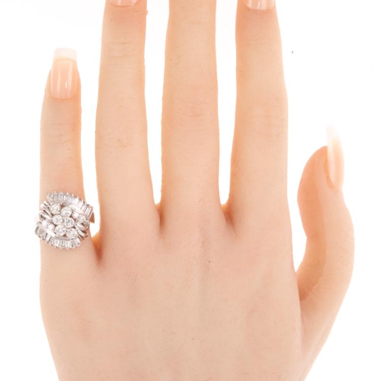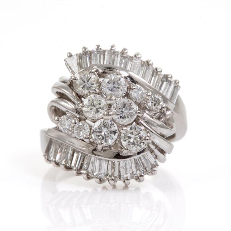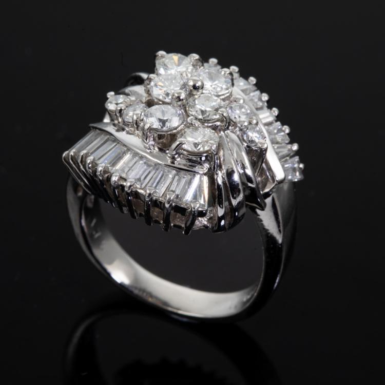 Diamond Dress ring with round & baguette cut Natural Diamonds totalling 1.75ct (Estimated grading: G-H SI). Platinum 900. Ring size G. Band width: 2.8mm. Weight: 9.0g. (Pre-owned).