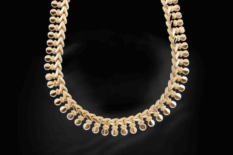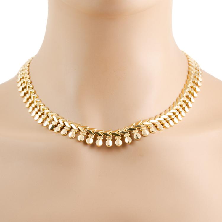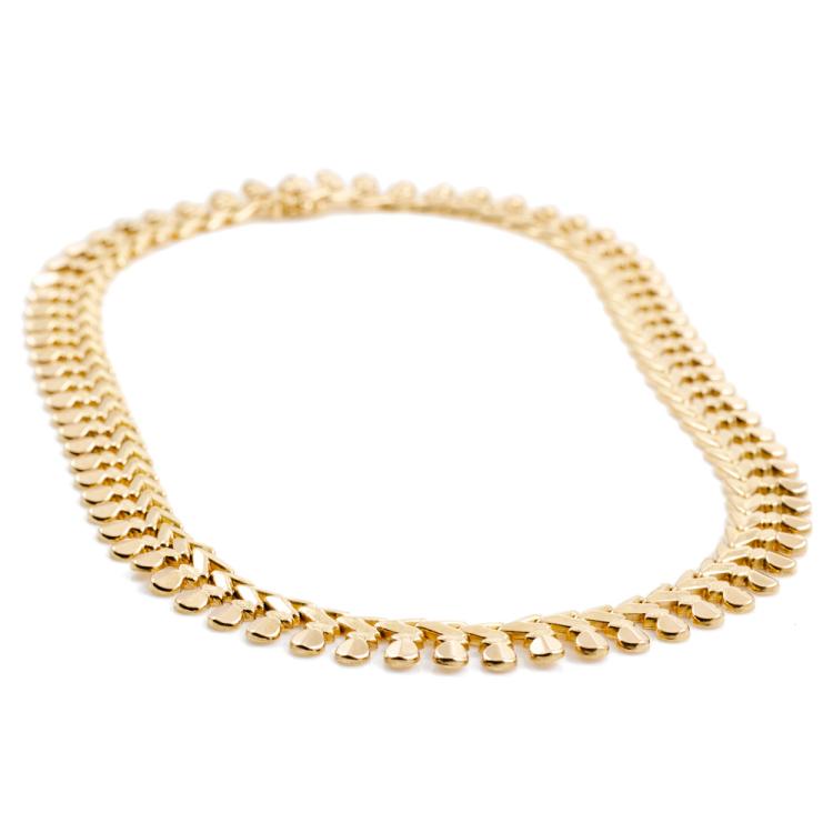 Gold Choker with hollow fancy links. 18ct yellow gold. Length: 44cm. Width: 1.3cm. Weight: 43.0g. With copy of GSL Valuation #AA 63603, Item 1. (Pre-owned)^