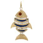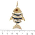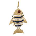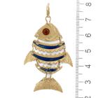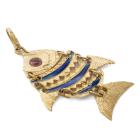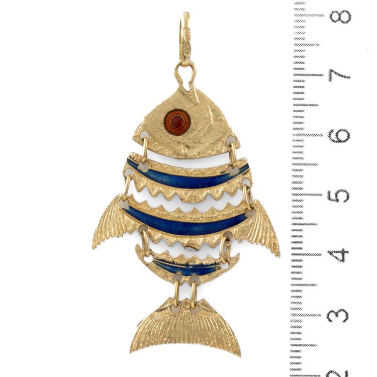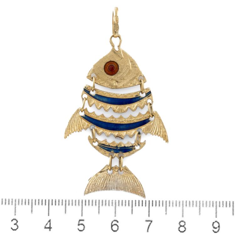 Fish design pendant with blue and red Enamel. 18ct yellow gold. Length: 5.5cm (including bale). No chain provided. Weight: 7.9g (As New)